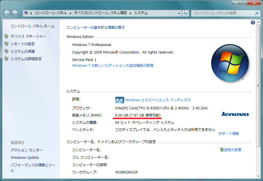 memtest86も走らせてチェックすればおおむねオッケーですが、ひとまずマイコンピュータのプロパティにて確認。キャプチャしときました。