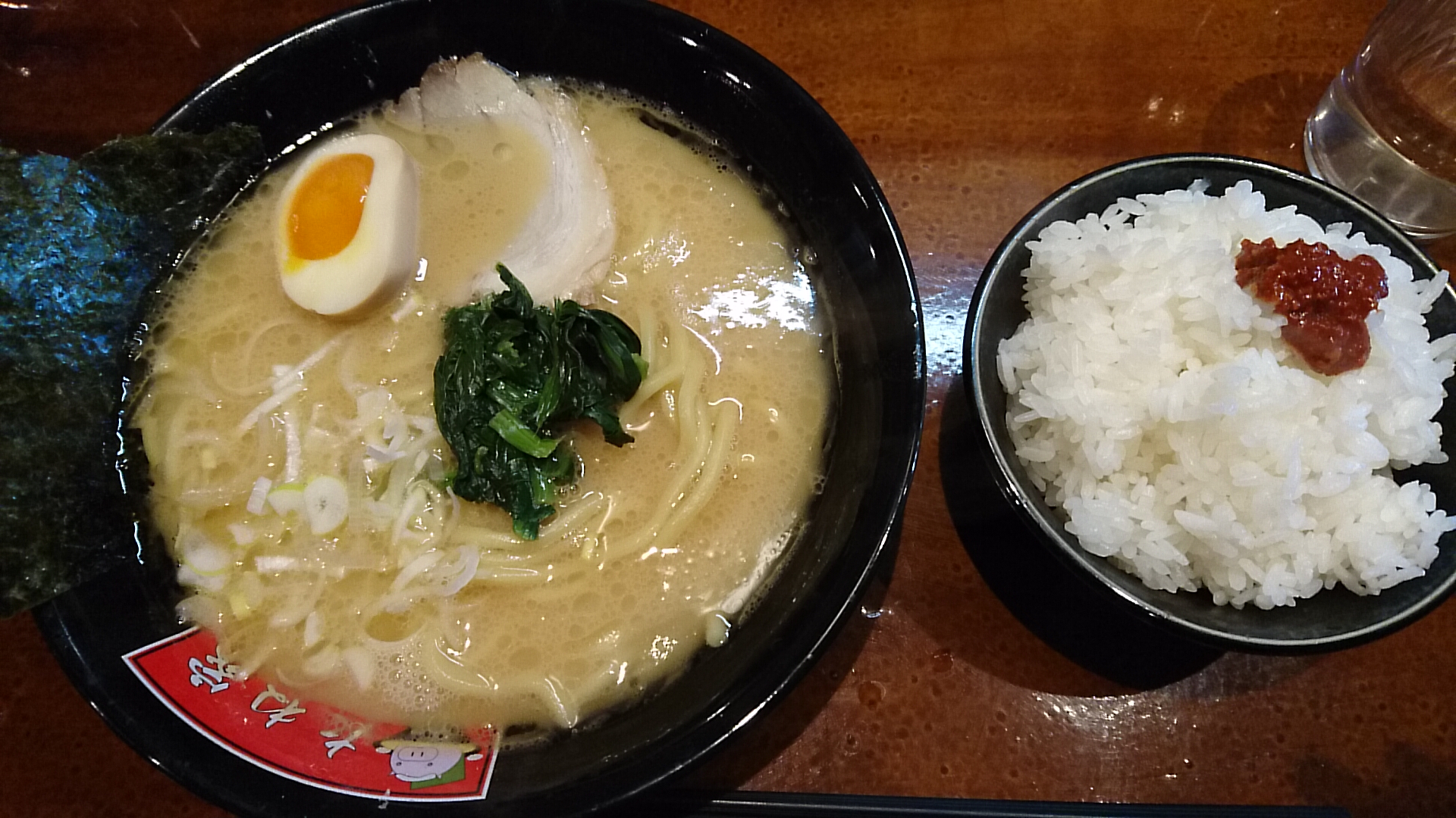 11:40頃の入店で先客1名、その後続々と来客有り、後客10名以上。メニューは初めてなので豚骨ラーメン並(680円)にライス(100円)。