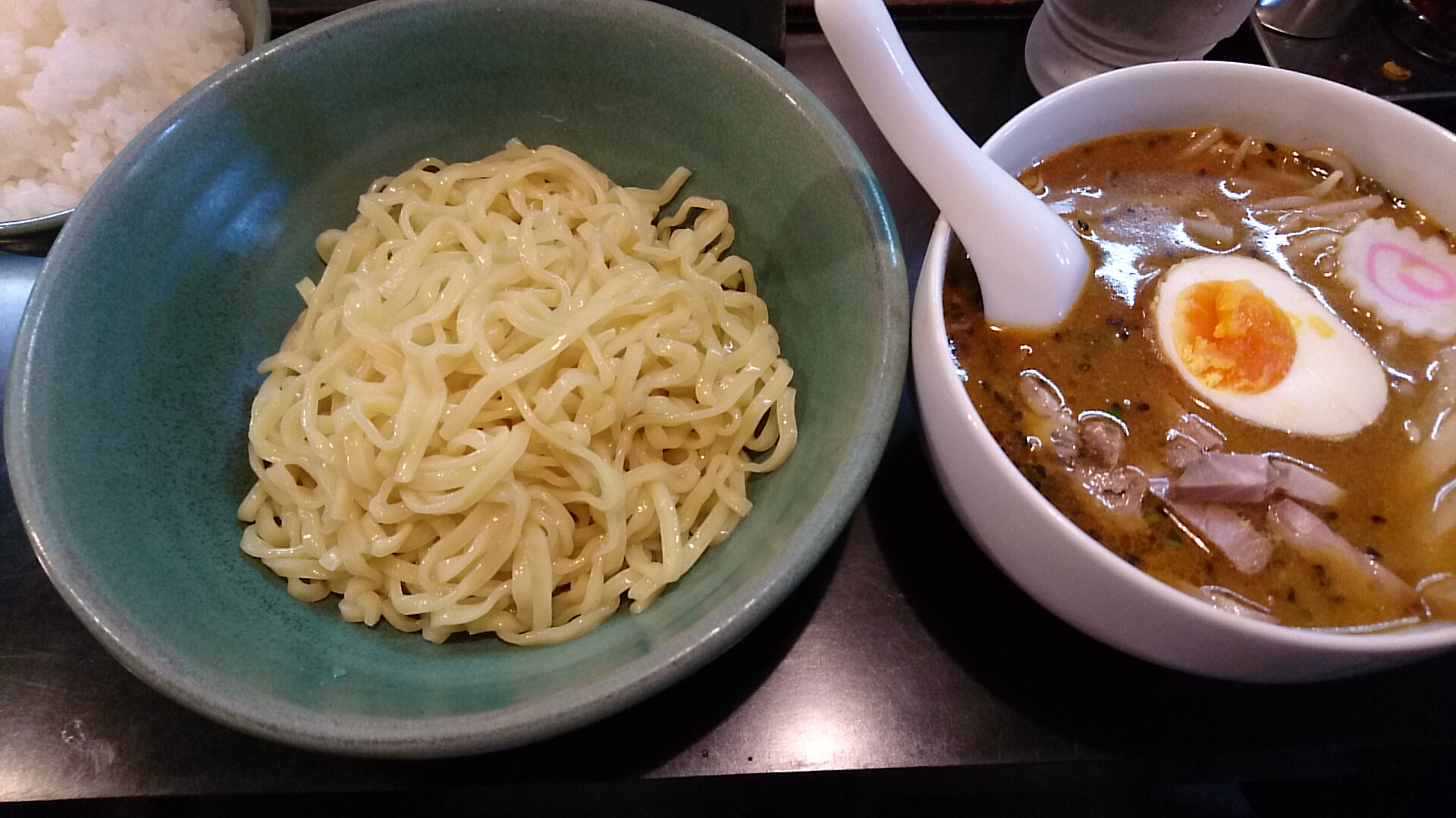 券売機はなく、口頭で直接注文。注文は赤味噌つけ麺に半ライス。同僚は赤味噌ラーメン。評判の餃子とカウンターに据え置かれたキムチは、においが気になるのでパスしました。