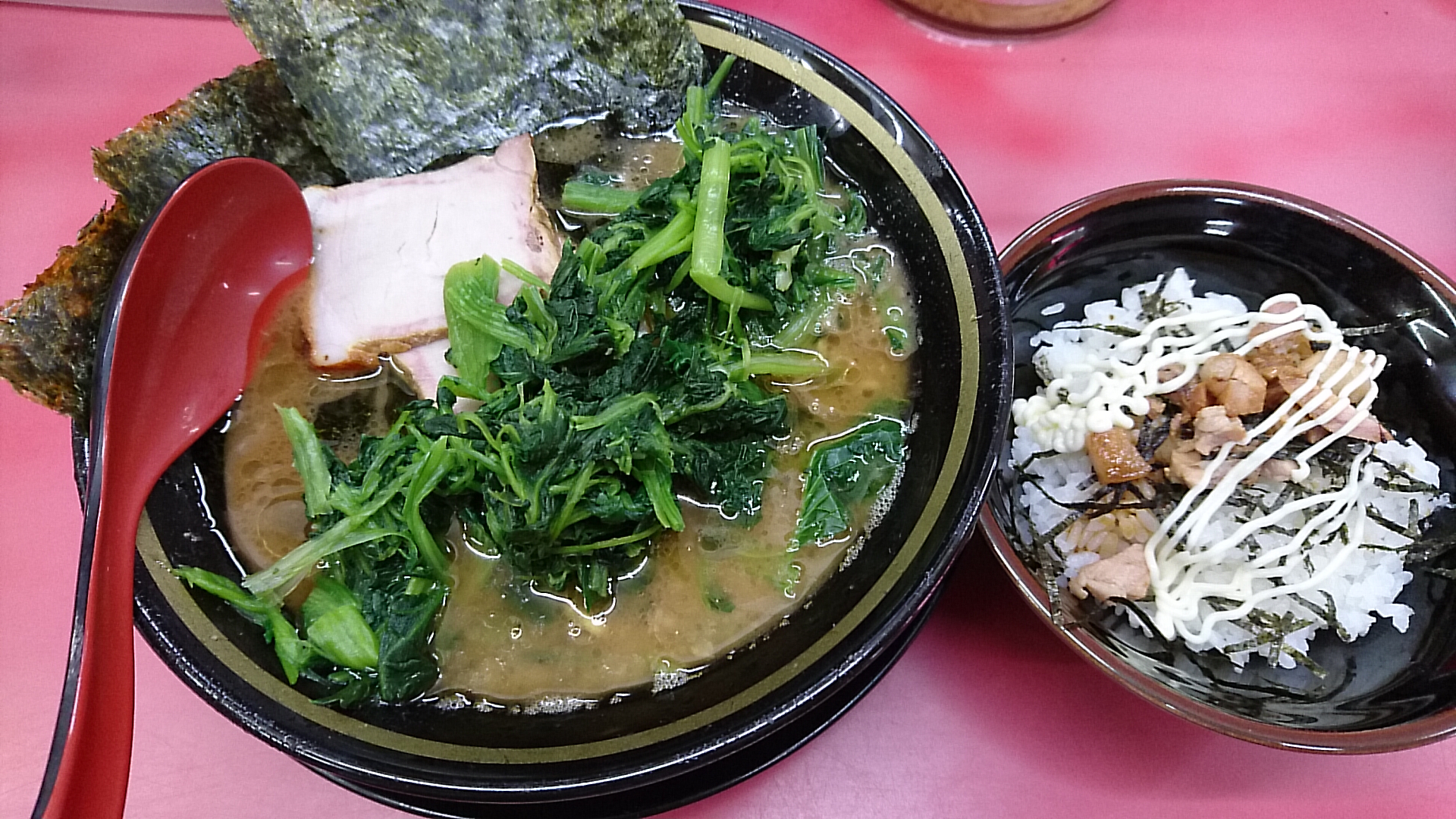 本日はラーメン並・油多めに半賄い飯はチャーシューまぶし、そして前回訪問時に課題にしていた生ほうれん草…を頼みたかったのですが、スタッフさんに聞いたところ、今月末まで無いとのこと。ダメだったか…しかしめげずにノーマルほうれん草は注文。