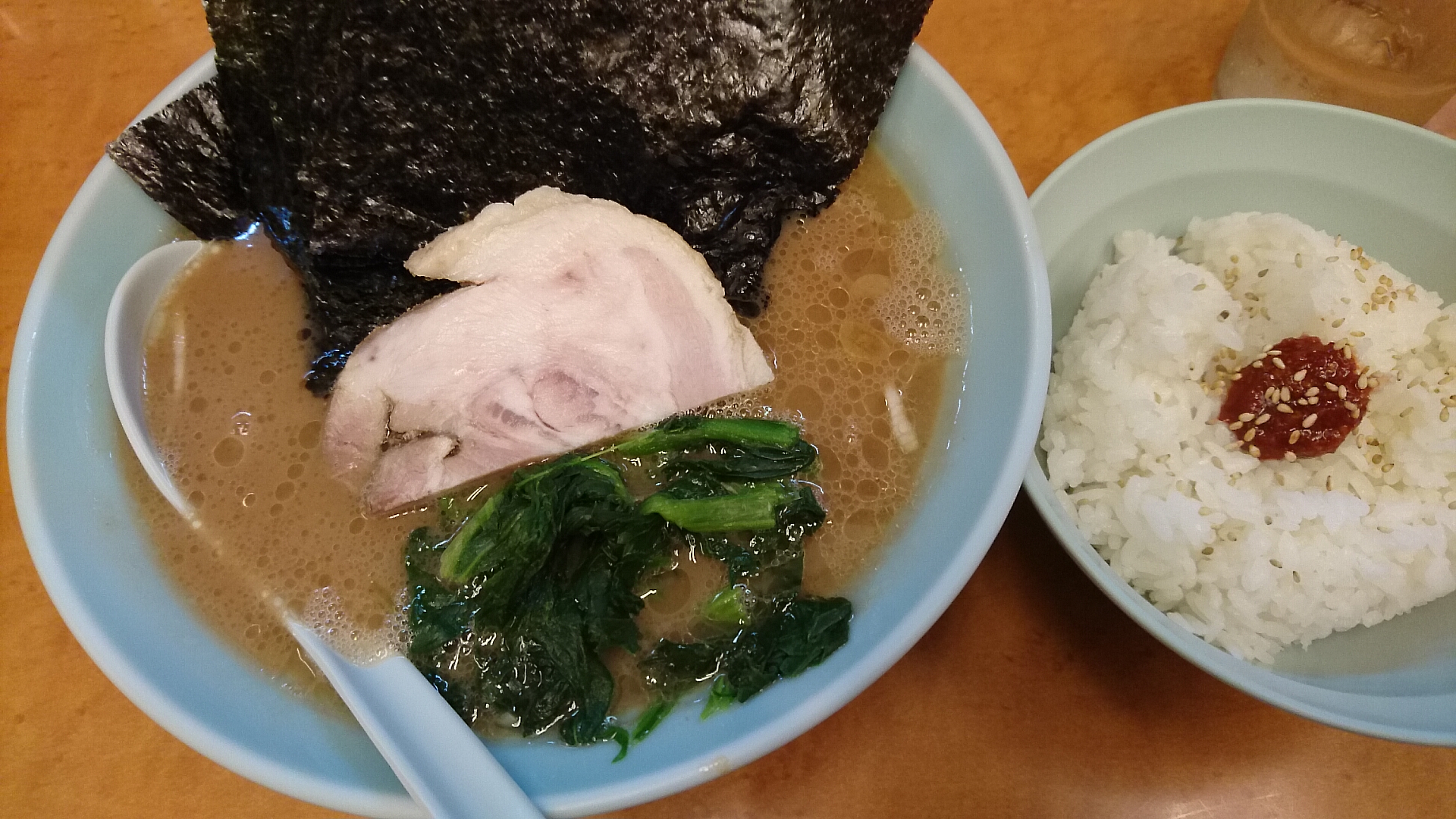 家系中華蕎麦(並)に海苔増し(5枚50円)、注文はすべて普通、サービスのライス並をつけてもらいました。