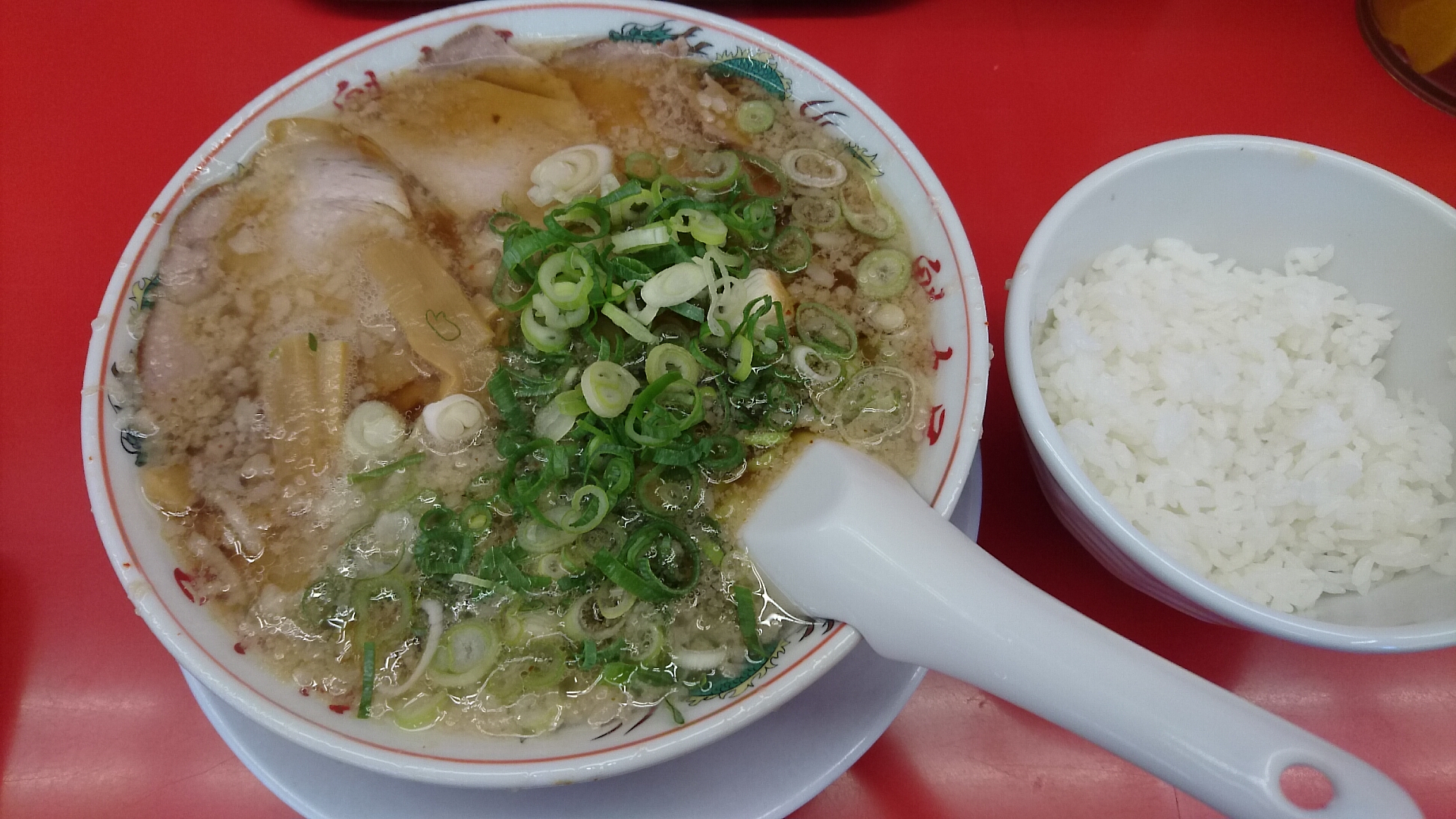 3~4分ほどでラーメンとライス、しばらくしてから唐揚げ到着(写真忘れましたwww)。