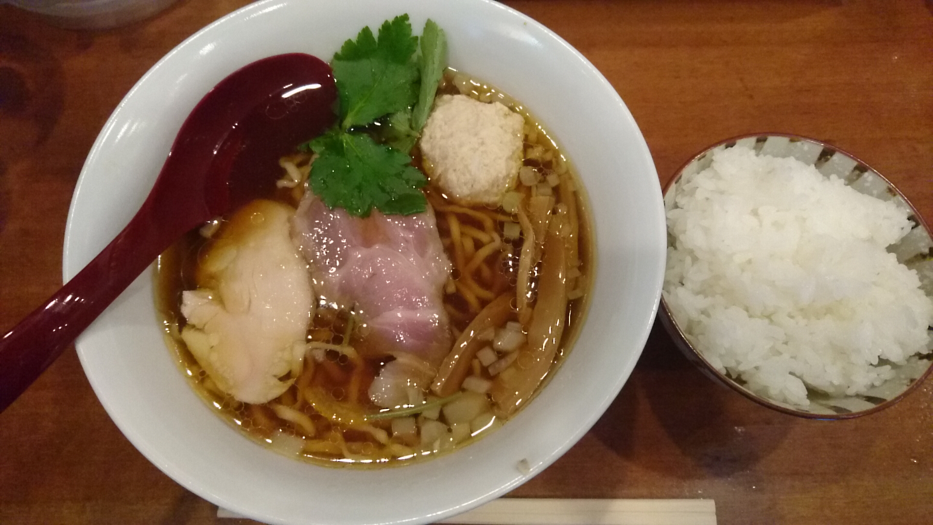 基本メニューは醤油と塩、そこにチャーシュー麺やネギ、岩海苔を加えたメニューがありましたが初訪でネギ、岩海苔はどうかな?と思ったのでスタンダードな醤油らぁ麺にライスを。