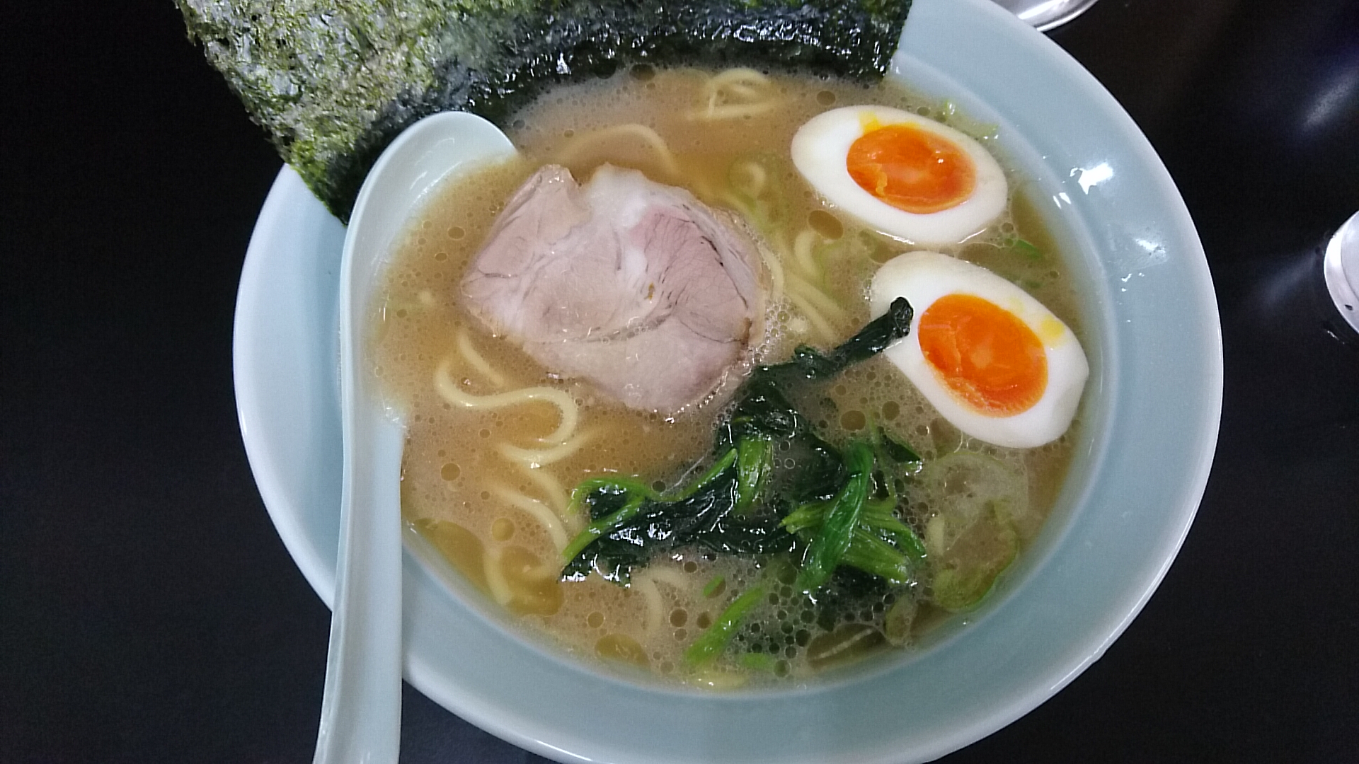 14時頃入店で先客2、後客2、注文はラーメン並に、ほうれん草が無かったので、代わりに味玉をトッピング。お好みはすべて普通で。