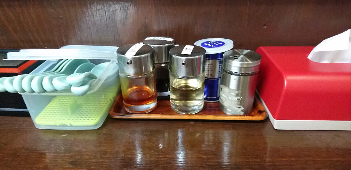・ニンニク・生姜・豆板醤の『家系薬味トリオ』はカウンターにもテーブルにもなく、ポットのあるテーブルに1セットだけ用意されてました。なのでカウンターの薬味は胡麻、胡椒、餃子用とおぼしき醤油、辣油、お酢などです。