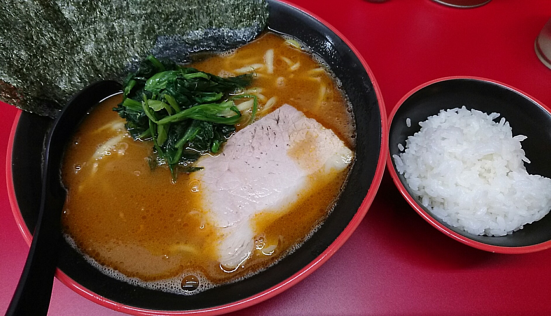 紅辛ラーメン並+海苔増し、半ライス
