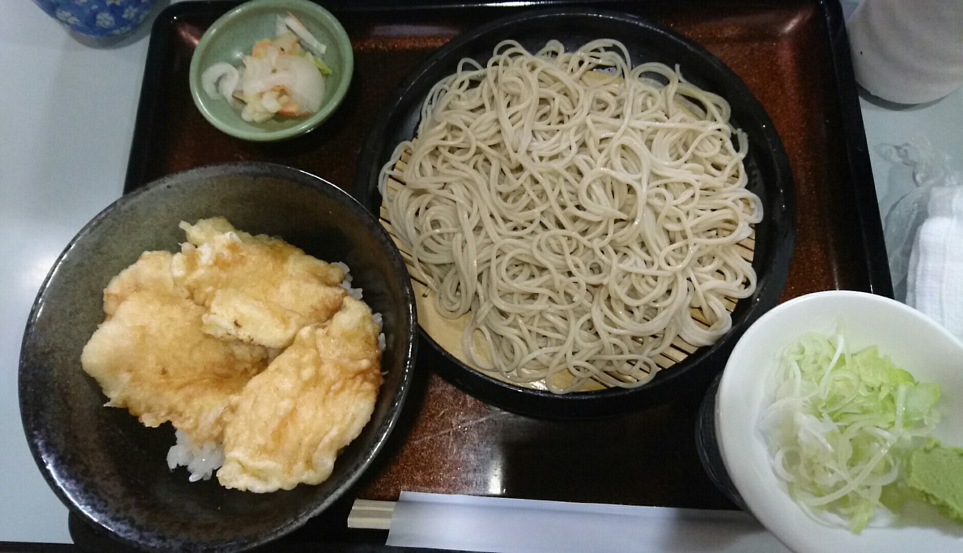 注文は鶏天丼セットで、そばはもりそばを注文。
