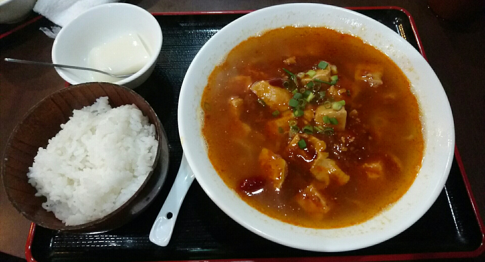 日替わり麺は麻婆豆腐麺とのことで、辛かった時の箸休め目的で小ライスを追加。デザートに杏仁豆腐がつきます。