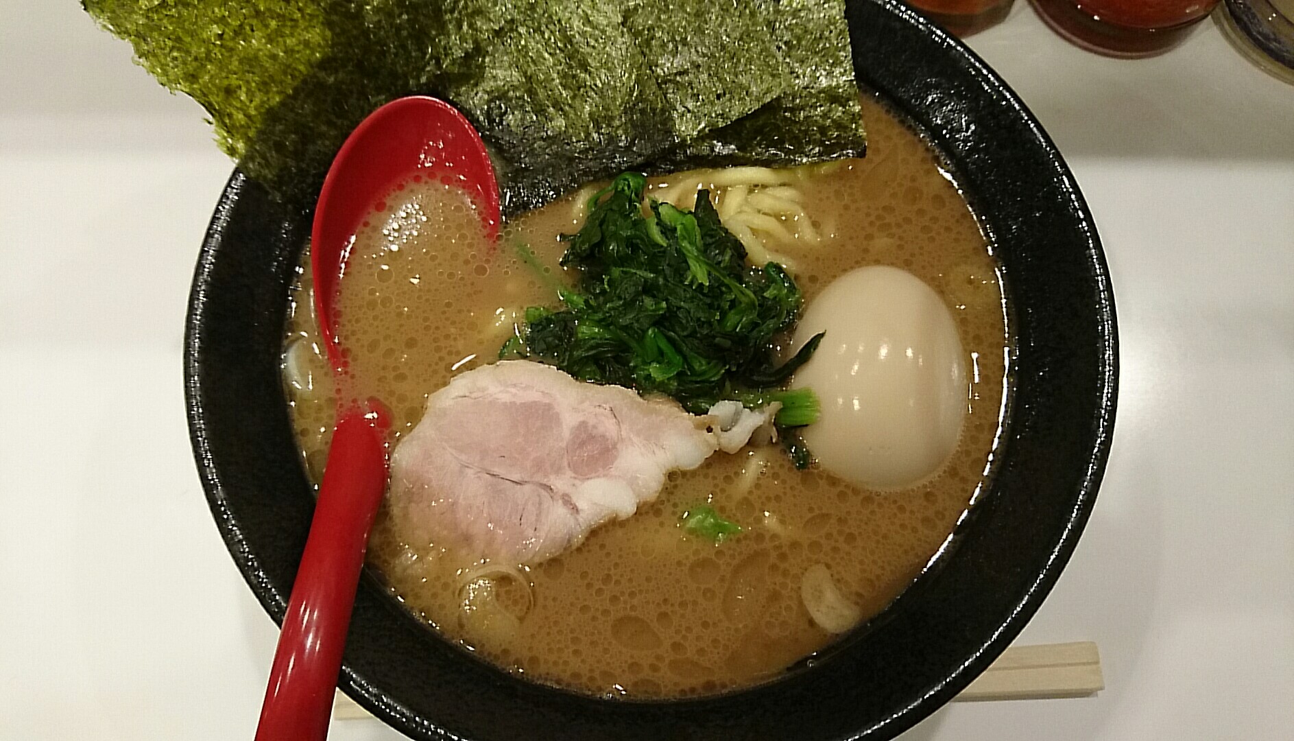 腹が減っていたけど、あまり時間がなかったので海苔増し+ライスのゴールデンコンビはガマンして、注文は豚骨醤油ラーメン並に、海苔の代わりに味玉を追加。お好みはすべて普通。