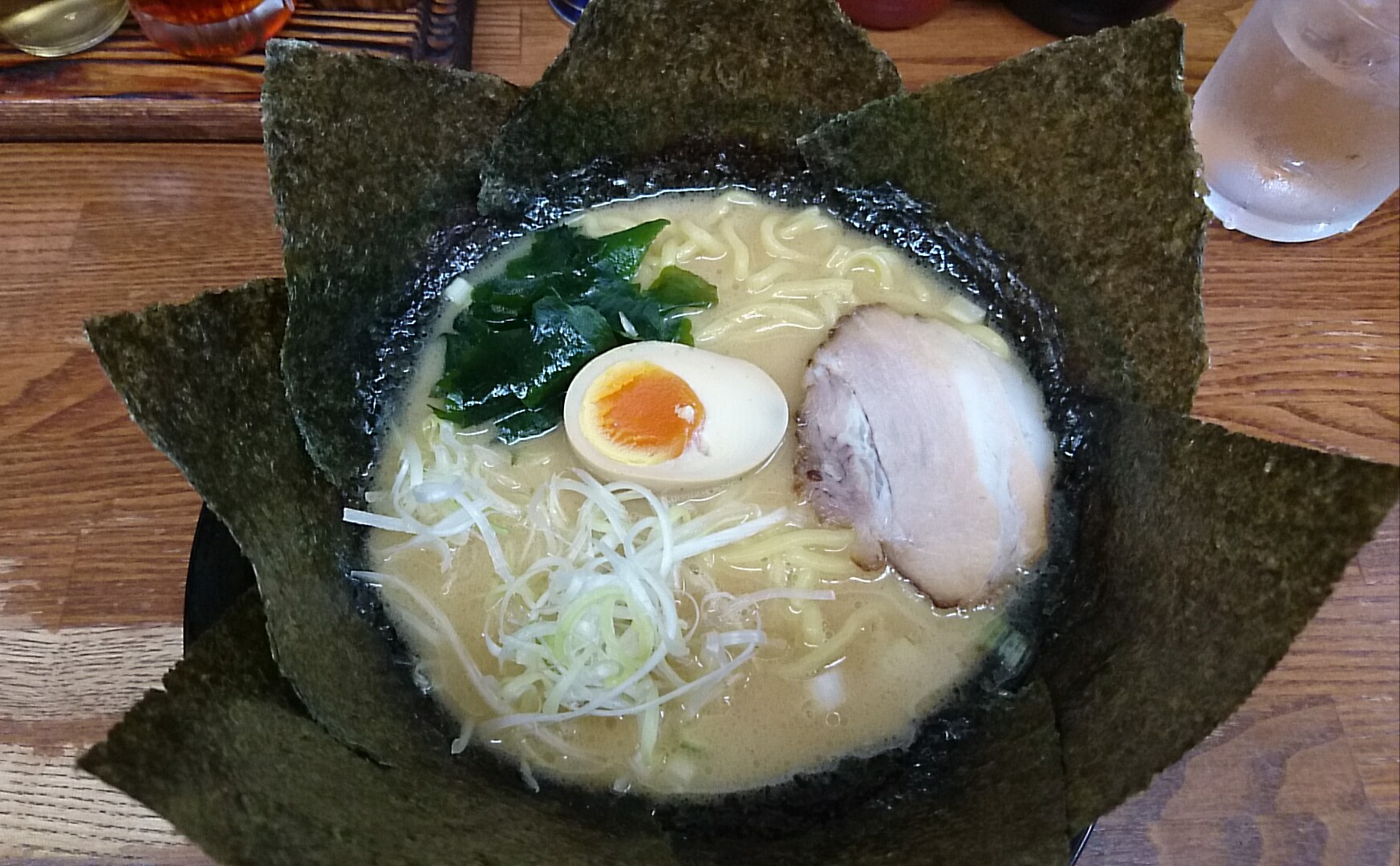 家系の青菜の代わりにわかめがトッピングされてますが、どちらかというと白髪ネギのほうが青菜のポジションかな?辛さはほどよく、麺とともにとんこつ海苔巻きでいただきます。