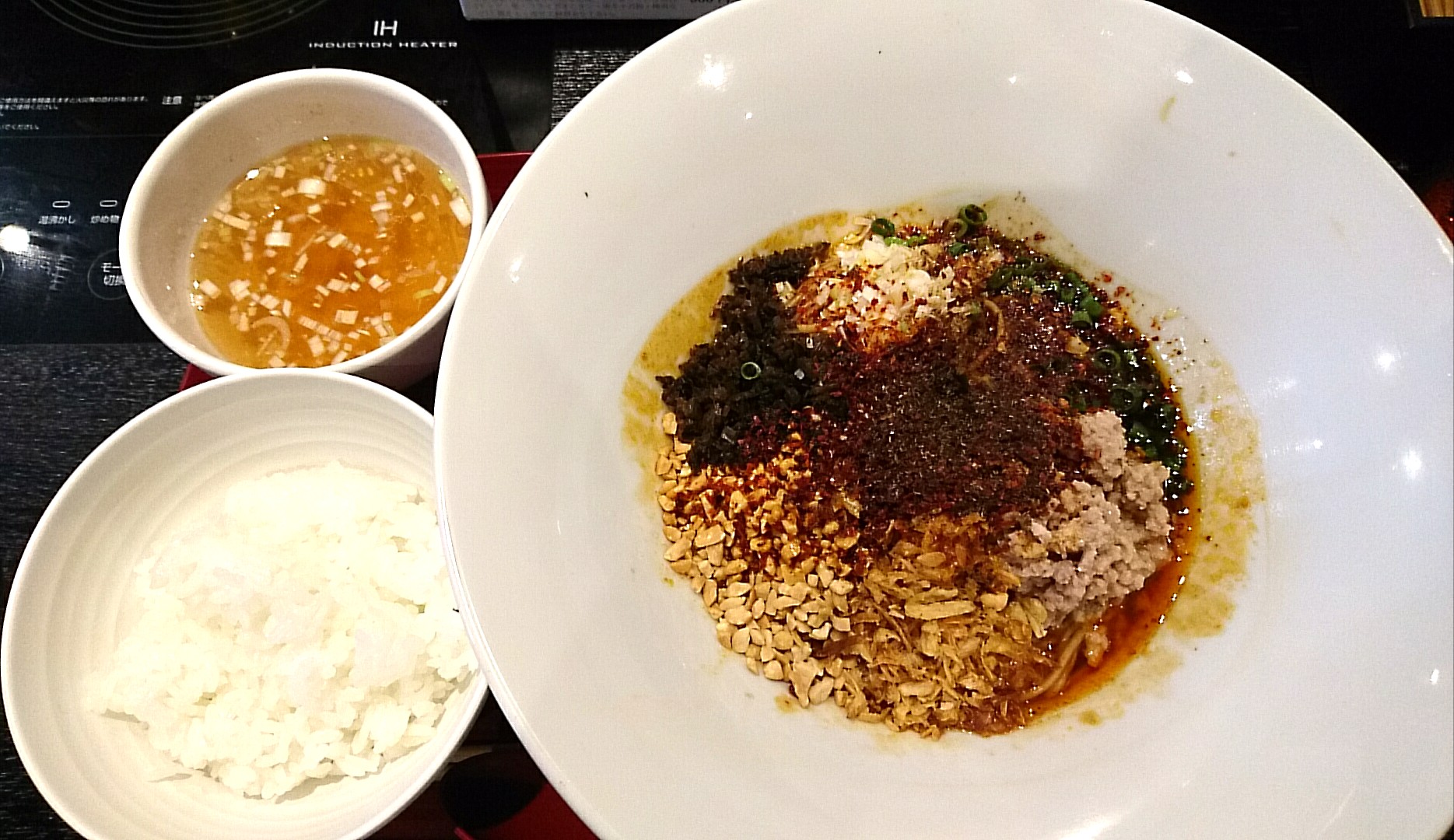 麺を食べ終わった後、挽肉や香辛料、ナッツが割と残るのでライスを投入して和えめしに!前回の冷やし坦々麺の教訓でライスを頼んで正解でした。
