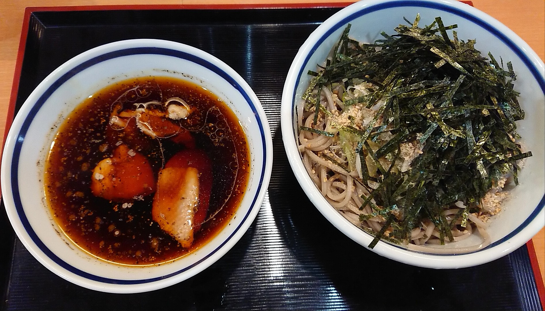 豚つけそばとの違いは、鶏肉がはじめからつゆに入っている部分。ここもほかのラー油蕎麦と同じスタイルですね。