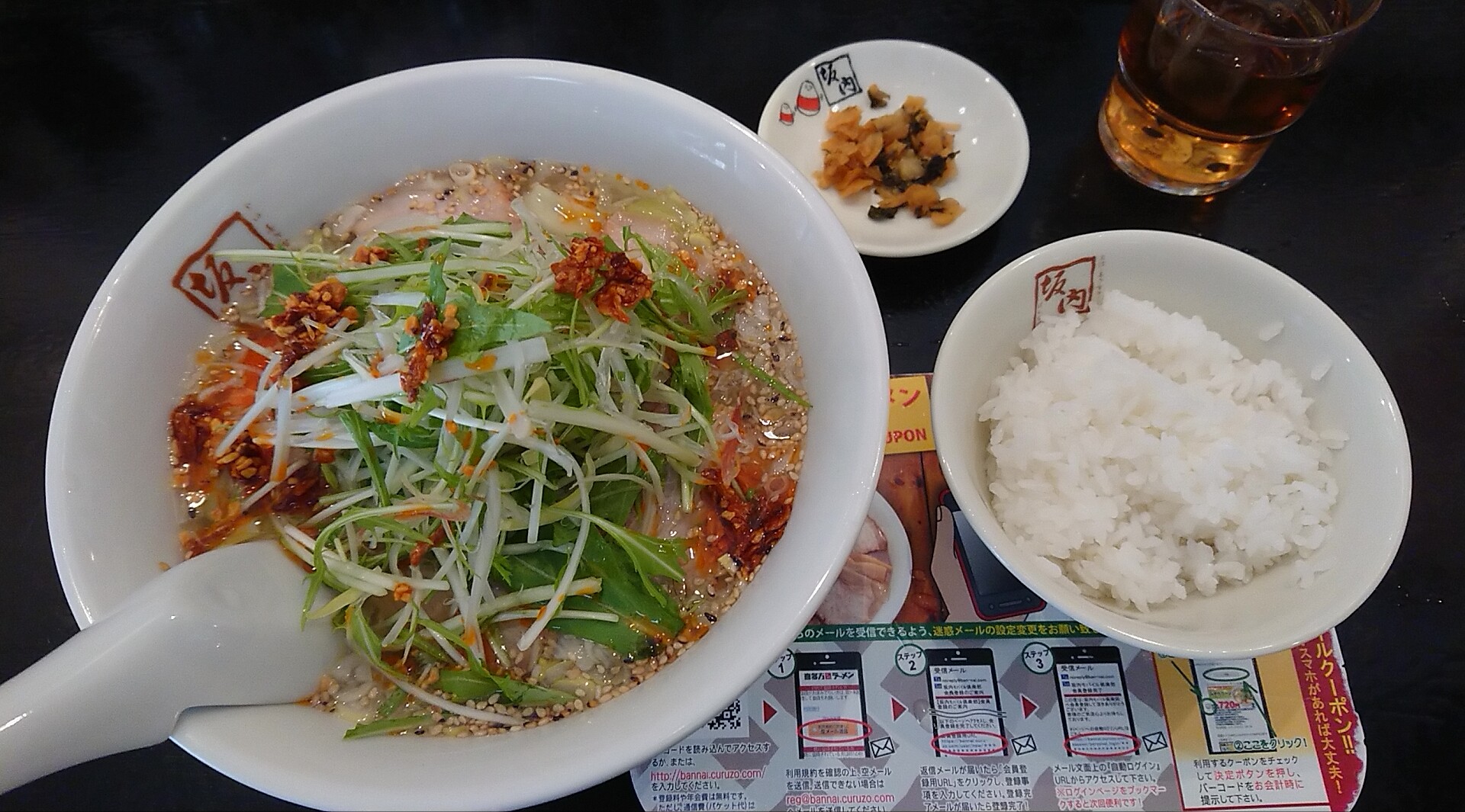 13時半頃の入店で入店率50%ほど、注文は『ピリ辛香ばし塩ラーメン』にランチサービスのライスを。