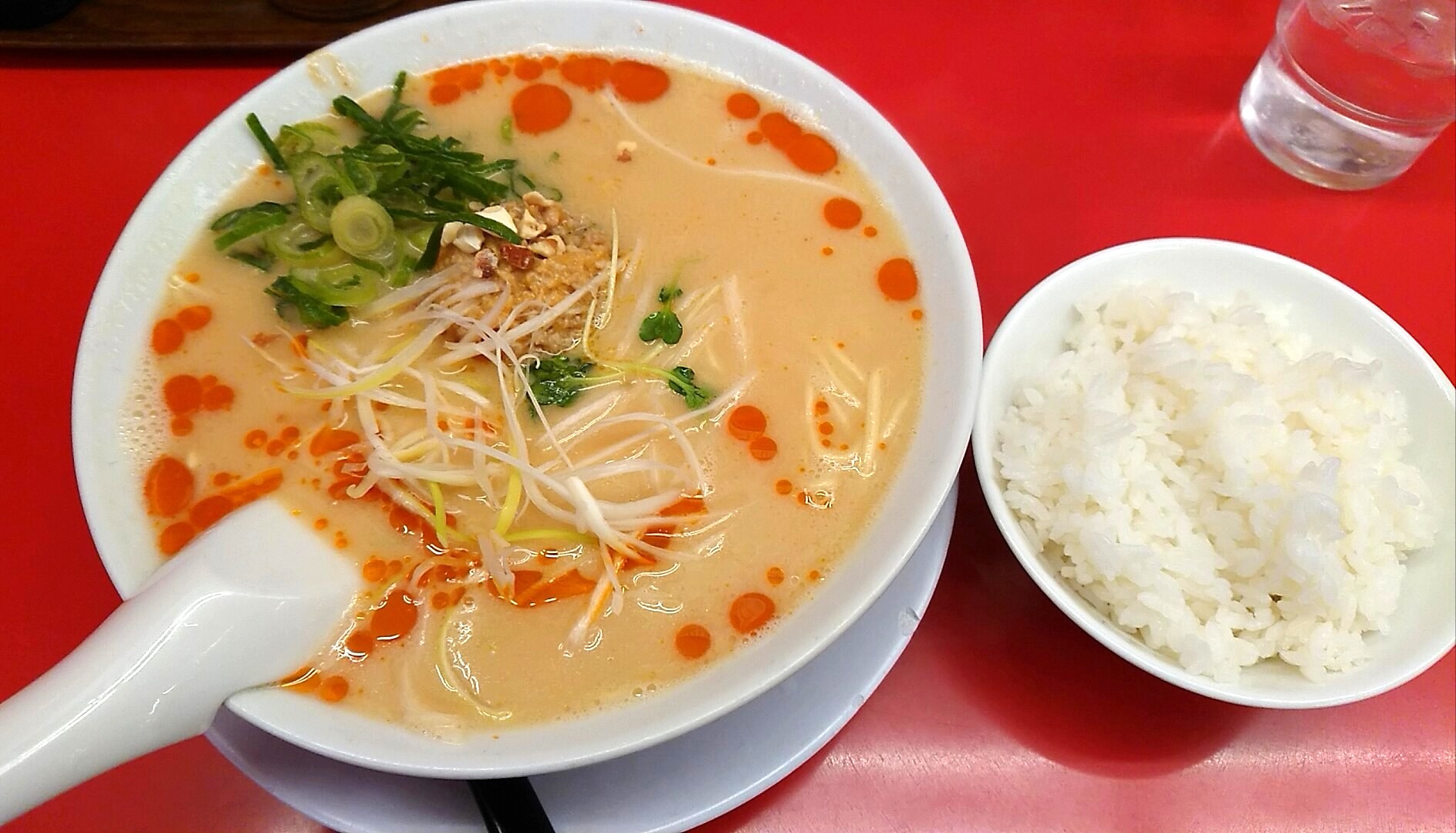 お約束の特製醤油ラーメンにしようと思ったら、限定メニューで『あさりラーメン』と『坦々麺』があり、坦々麺とDセットのライスに路線変更しました。