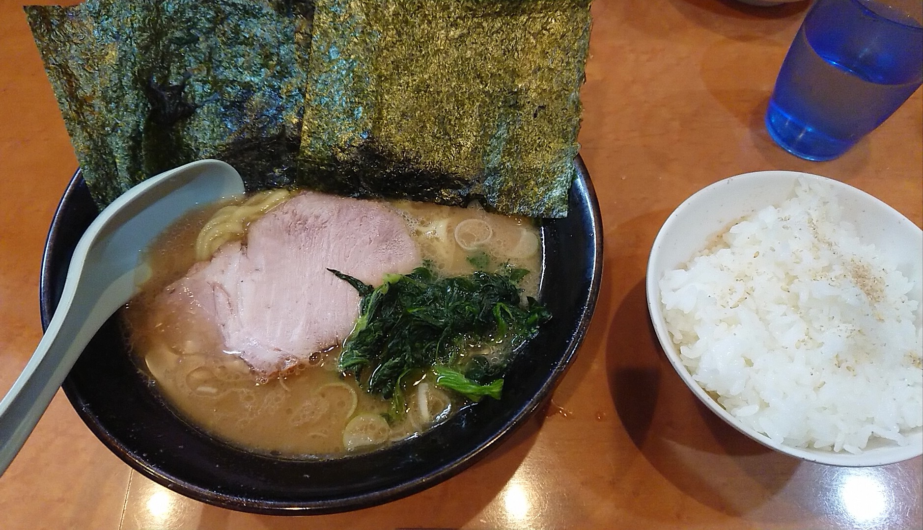 注文はラーメン並に海苔増しハーフ、半ライスの黄金コンビで!今回初めて塩ラーメンがラインナップされているのに気づきました(ノ∀`)イマゴロキヅイタ