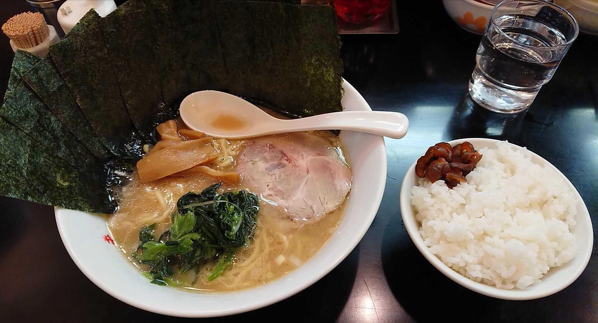 注文はラーメン並(650円)に海苔増し(100円)、半ライス(50円)、お好みはすべてふつう。立地を考えたらかなり良心的な価格設定です。とりわけ半ライス50円はステキ♪