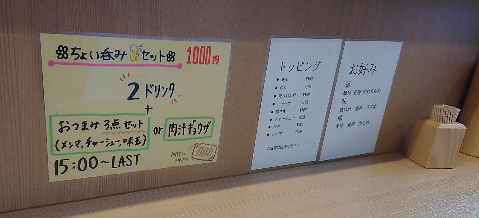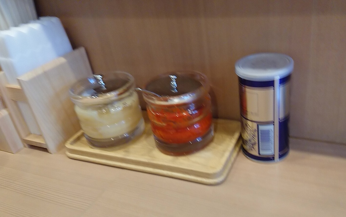 待っている間確認したとことしては、カウンターの薬味はニンニク、豆板醤、胡椒。