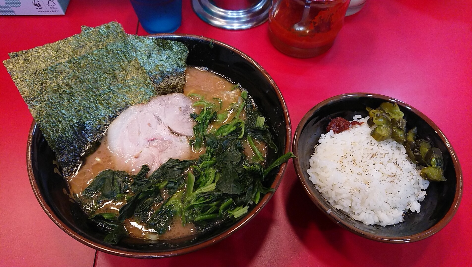 注文はラーメン並、ほうれん草、無料のライス。