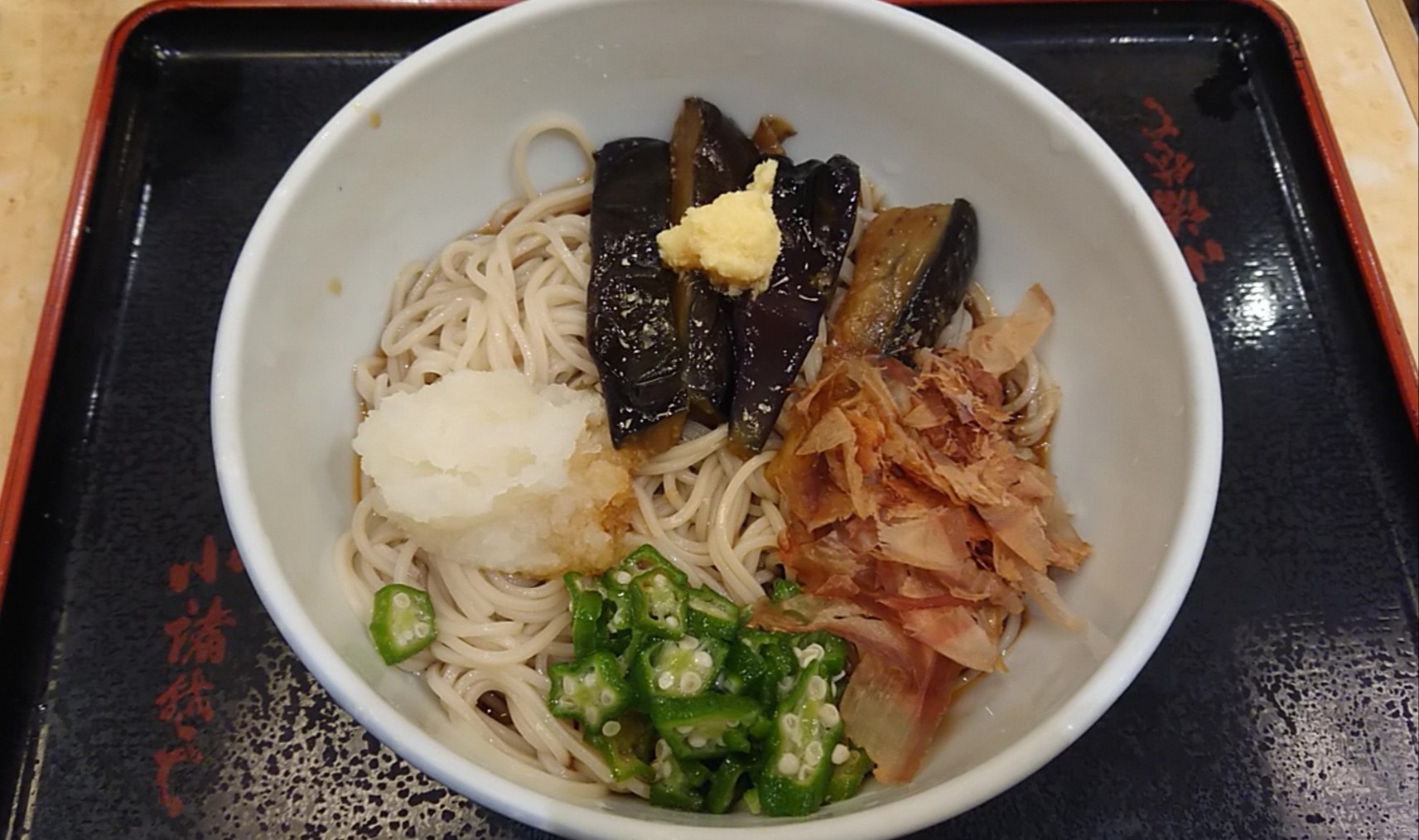 具は茄子の素揚げにおろし生姜、削り節にオクラ、そして大根おろし、おもったより具の種類も量も多め!