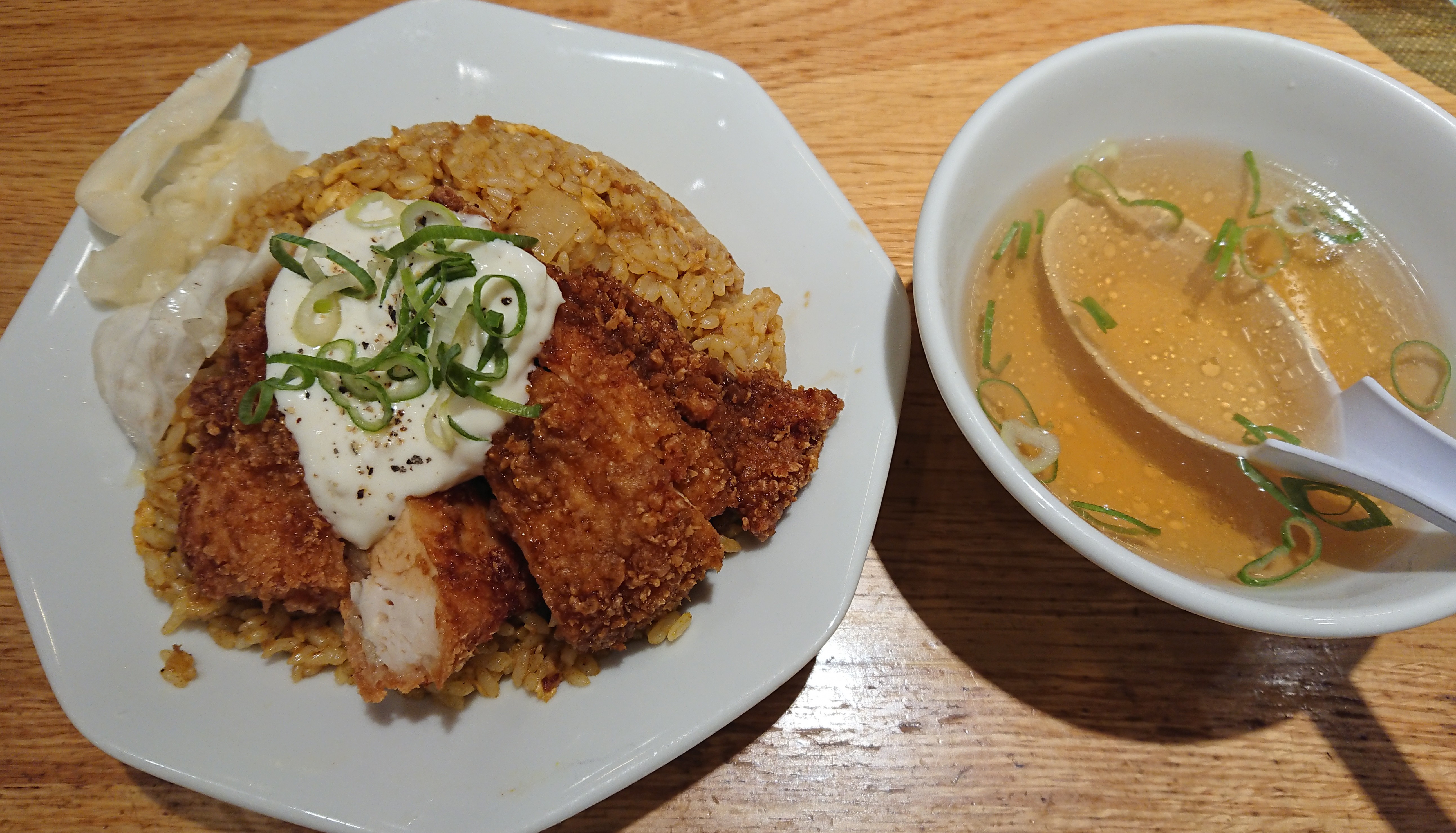 なんか濃い色合いの炒飯と細長い唐揚げだな、と下調べ無しで注文してしまいましたが、カレー(カリー)炒飯にチキンカツ&タルタルソースでしたwちゃんとメニューを確認してなかったとはいえ、全然違ったwww