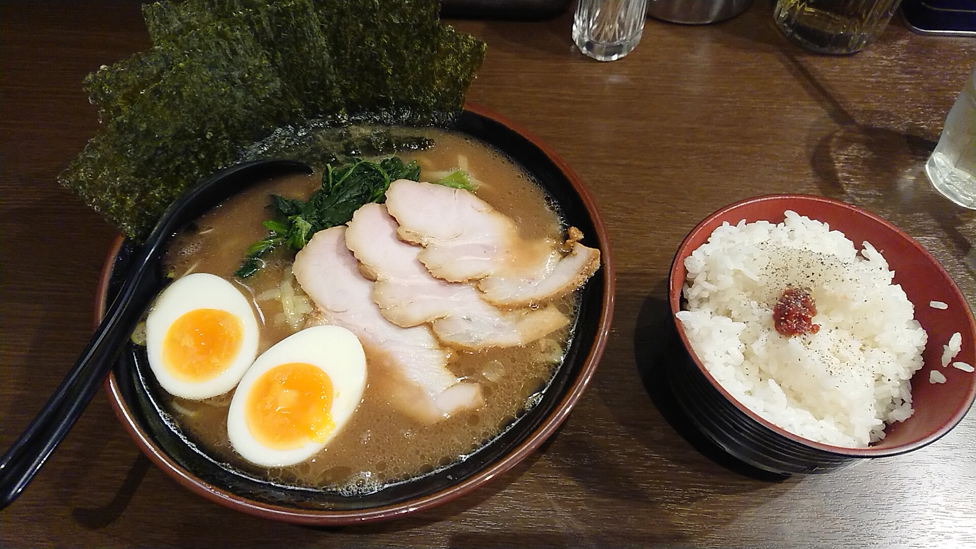 注文は海苔玉ラーメンにライス、お好みはすべて普通。こちらの屋号はデフォルトで海苔が1枚なので、海苔増しはマストですね。