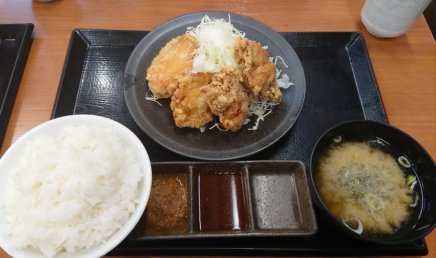 定食で行くか丼もので行くか迷いましたが、初めてだったのでデフォの唐揚げを食べてみたかったのと、同時に限定の”秘伝にんにくからあげ”も気になったので、両方味わえる『合い盛り定食』なるメニューがあったのでこれで決まり!