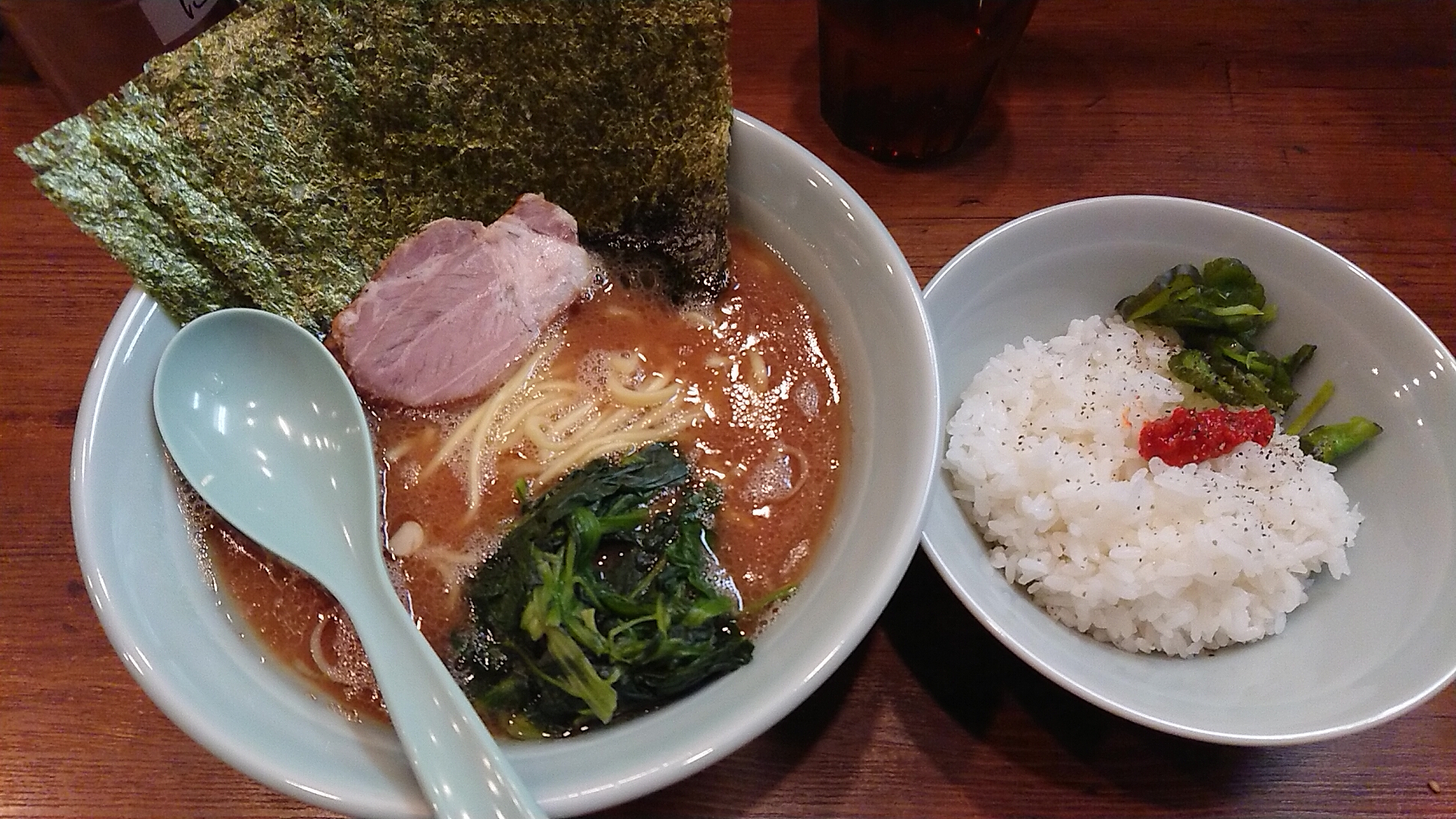 注文はラーメン並(680円)に海苔(100円)+食べ放題の50円ライス。武蔵家系ながら無料ライスの提供はランチタイムのみとのこと。