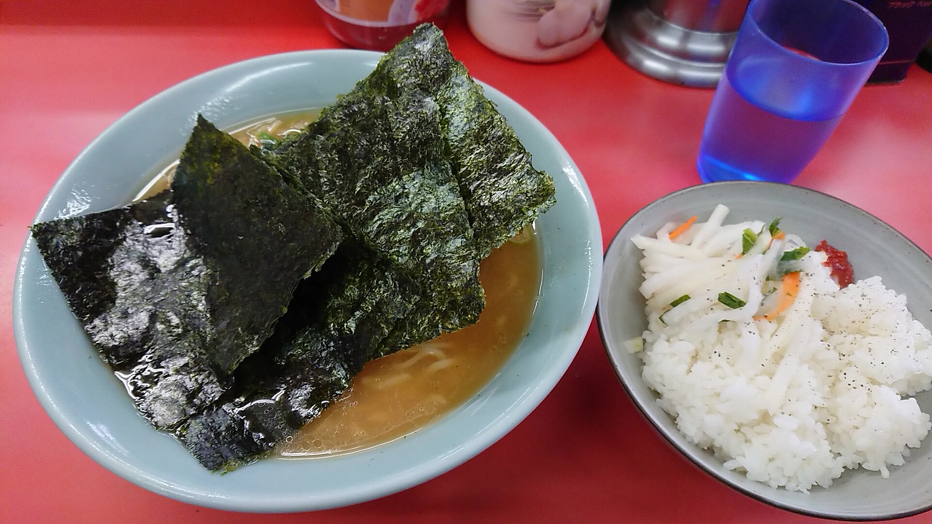 海苔はデフォで4枚、食べる前にドンブリのふちに指して、あらためてスープに浸して海苔巻きにしてからライスに巻きます。風味、色合い、ともに良し!