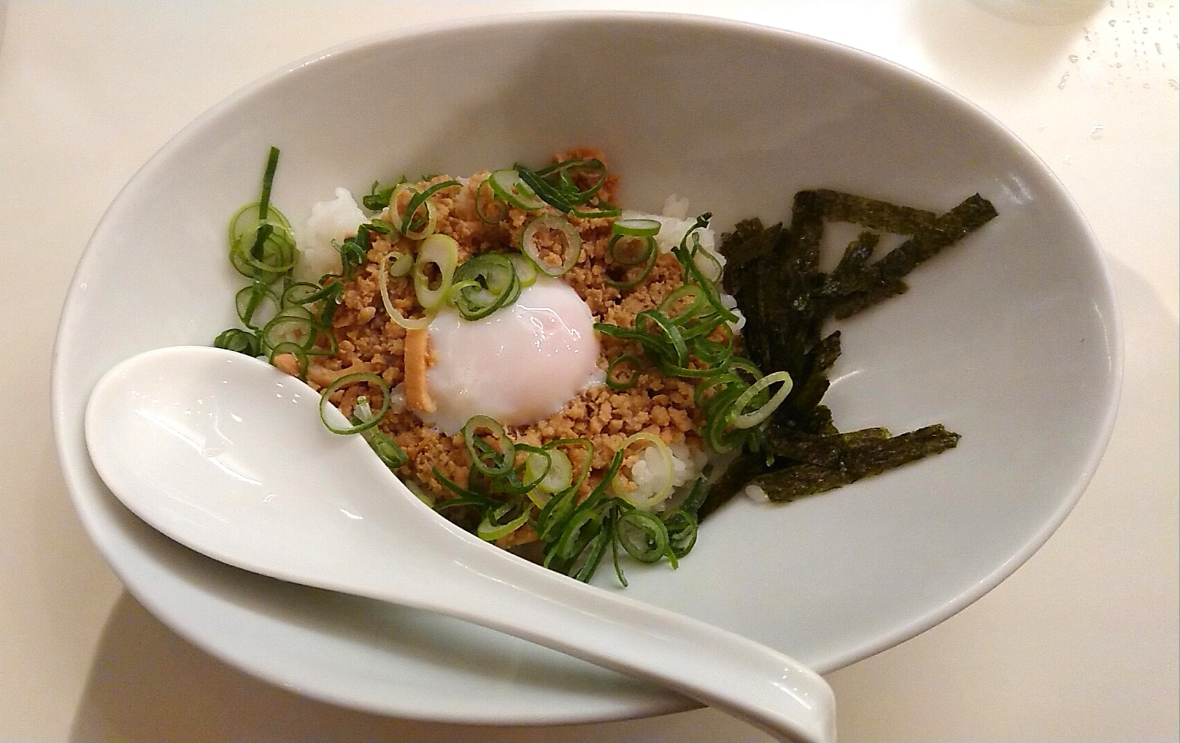 やや甘めの甘辛ダレは味が濃いめなのでネギ、海苔、半熟卵を混ぜてマイルドにしてからいただきます。