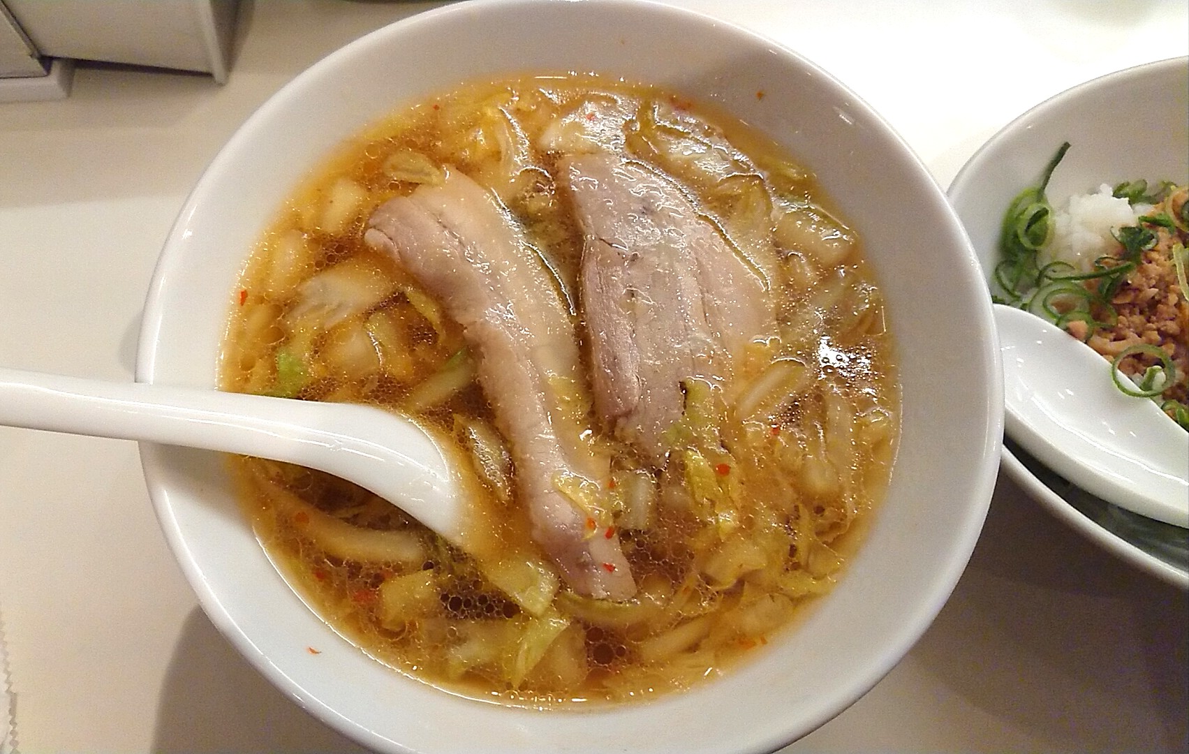 つづけて定番のラーメン、少しだけピリ辛ながら白菜から水分が出るので、食べ進めるとマイルドになるお約束のスープ。