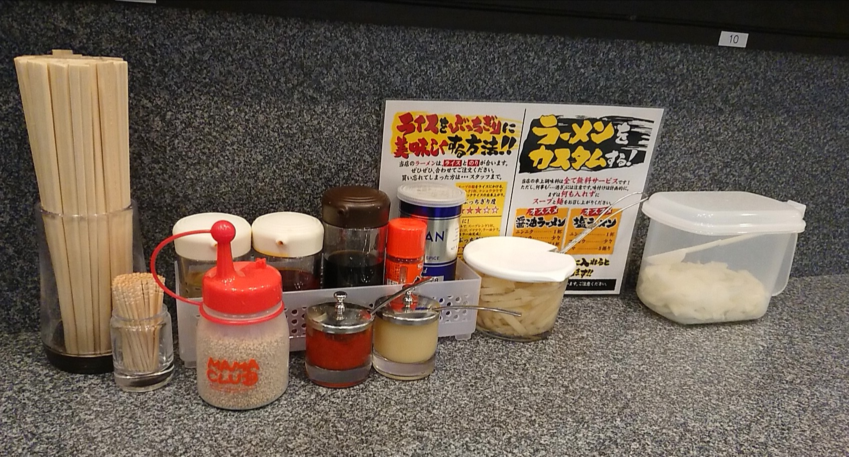 この手のCPS店に用意されている刻み玉ねぎを少し入れてみましたが、開店からさほど時間が経っていない割には『時間が経ってやや乾燥気味になり、辛みを含んだ臭いが強め』の状態になっていたので、開店前に仕込んだものではなく、前日に刻んだものを冷蔵しておいたか、業務用(あるのかな?)かも知れません。具は全体的に頑張ってほしいと感じたところ。