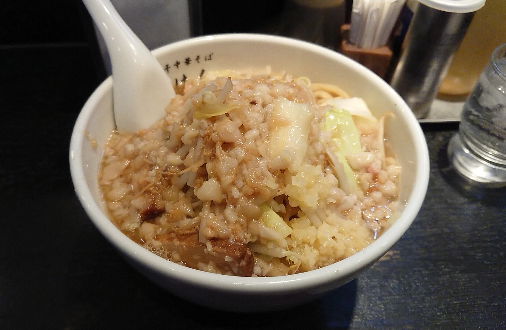 二郎よろしく注文時に野菜の量(倍量まで無料)とニンニクについて聞かれますが、野菜はボリュームが見えなかったので通常の量に、ニンニクは午後は会議が無いので入れてもらっちゃいました。