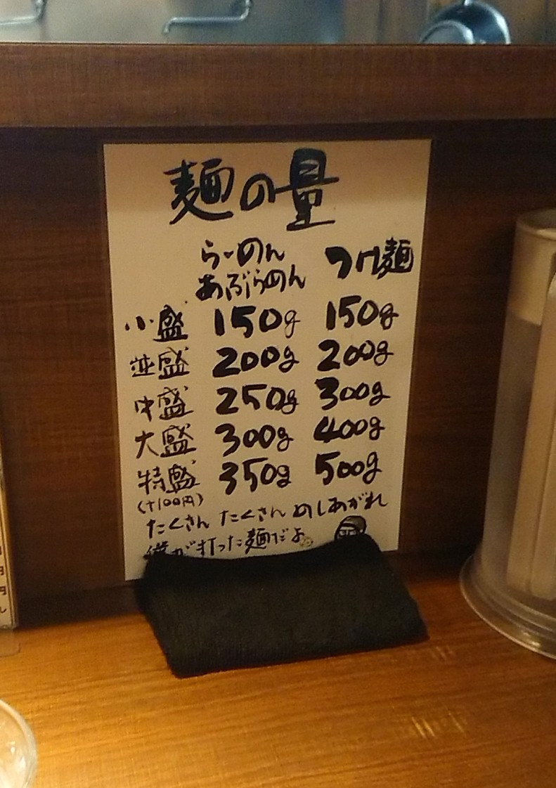 麺量はらーめんの場合は50g刻みで150、200、250、300まで通常料金とお得な価格設定で、350gは特盛で追加料金とのこと。さらにつけ麺だと500gまで無料とのことです。
