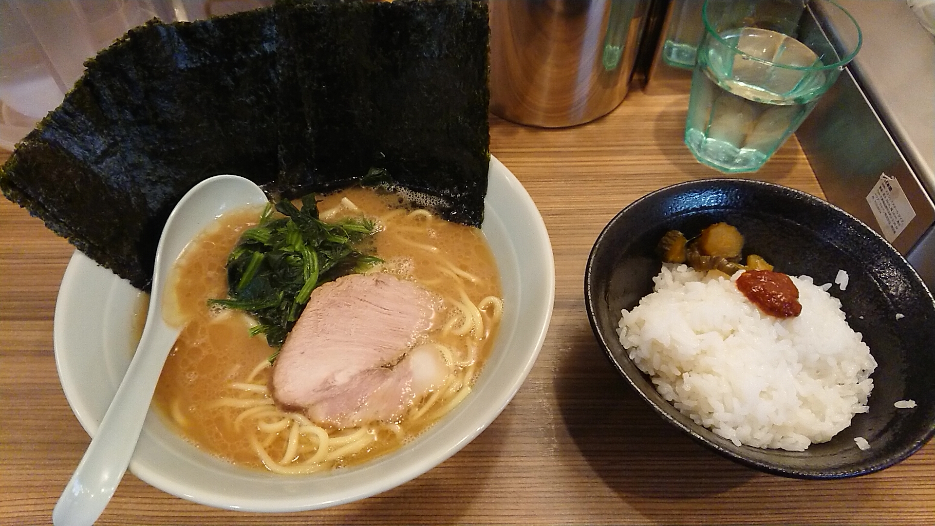 注文はラーメン並に海苔、サービスのライスは中にしてもらいました。お好みは麺固めで。