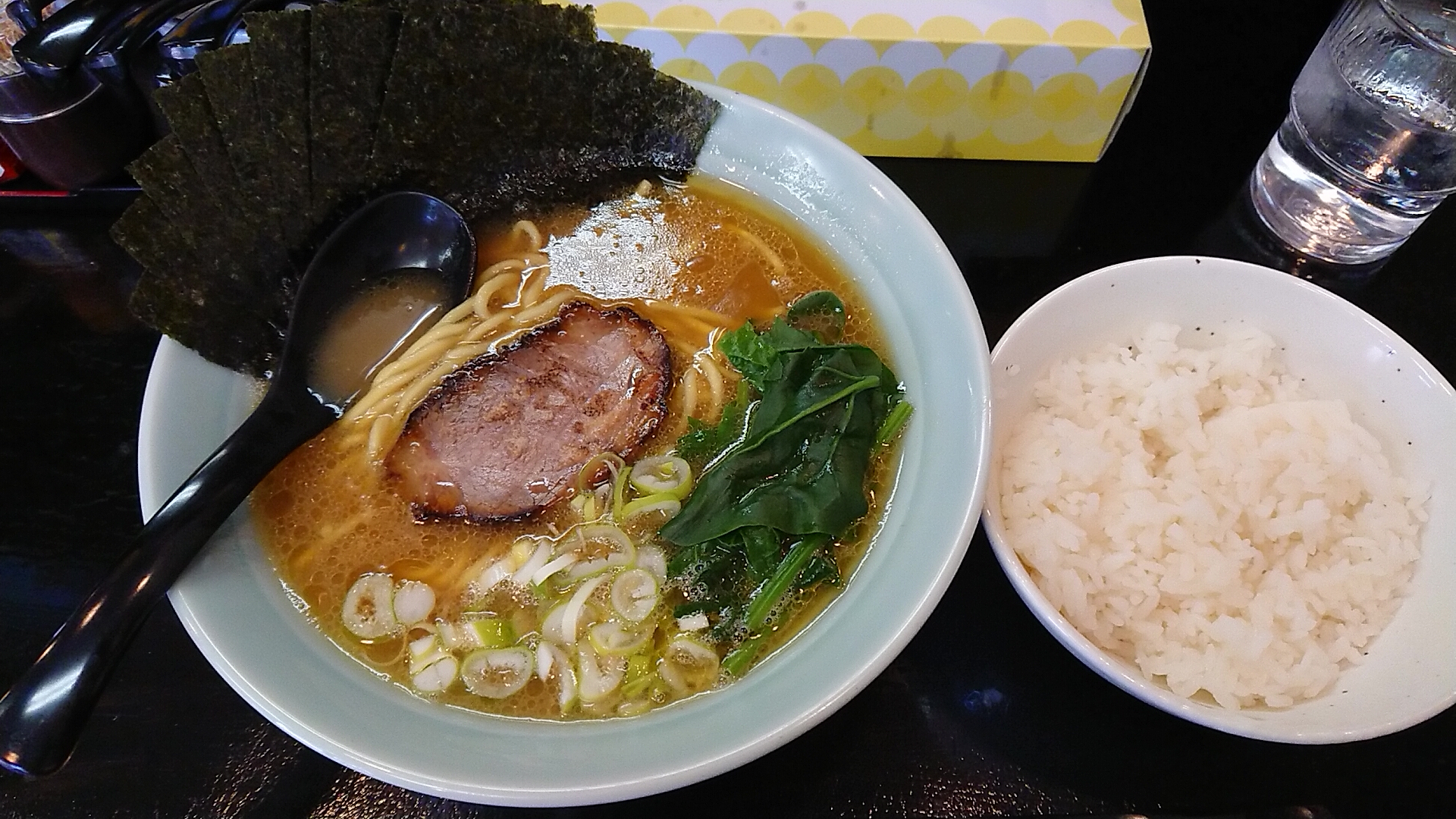 注文はのりラーメン並に小ライス、食券を買いそのままスタッフさんに渡します。初めての訪問なので注文はすべて普通。