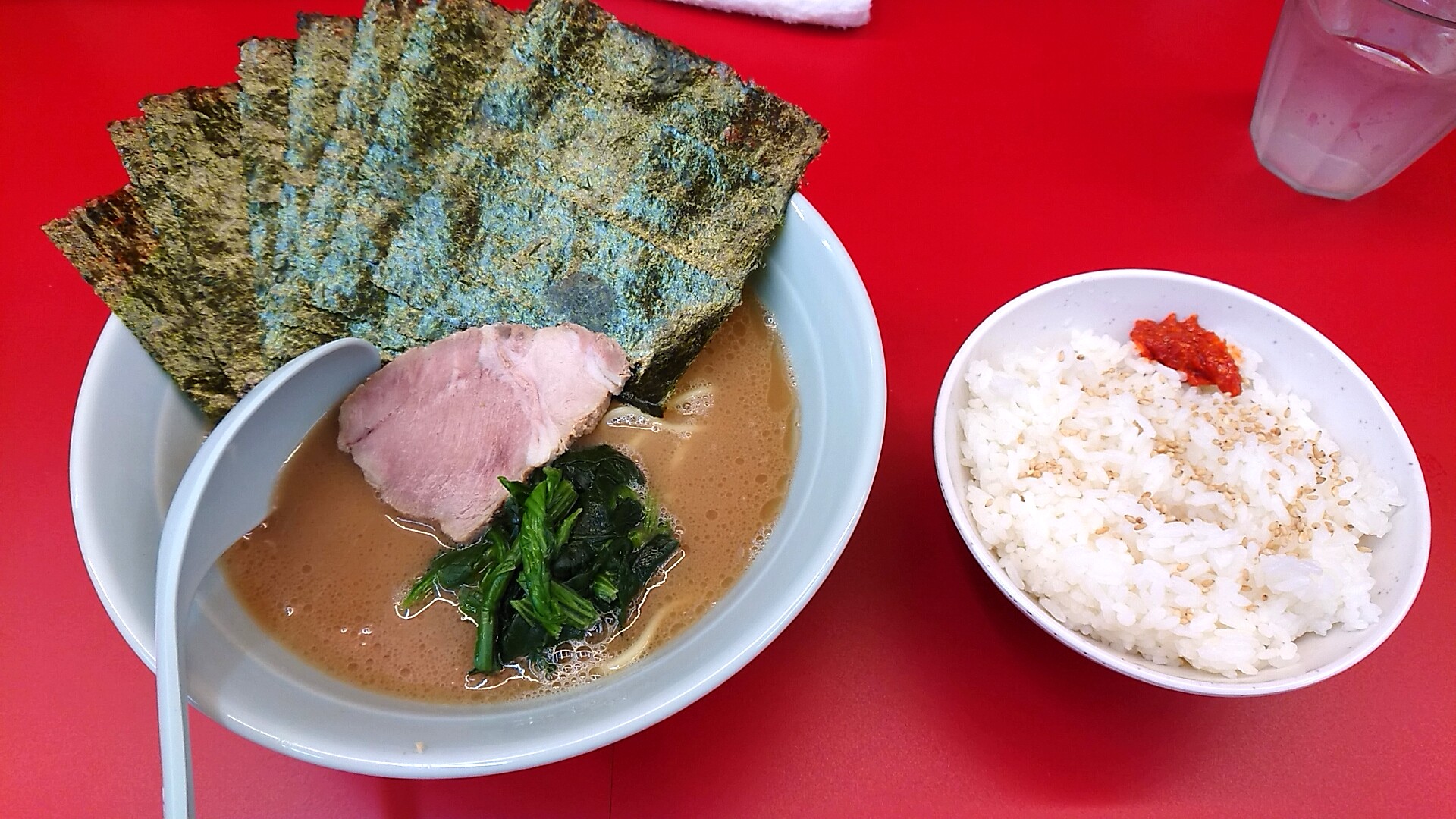 ラーメン並に海苔(50円)、スタッフさんに食券を渡す際にサービスのライスを注文。お好みは麺固めのみ。