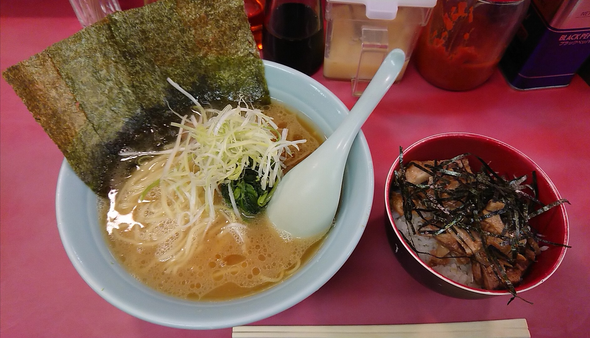 注文はラーメン並に、ネギ増し…にしようとしましたが、ほかのレビュアーさんがアップしたネギ増しの写真を見たらちょいビビりが入り、ネギはシャキシャキ触感を楽しめればいいので、ボリュームは普通でいいかな、ウン(゚Д゚;)ということで方針変更して、代わりにミニチャーシュー丼を頼んでみました。お好みは麺固め。