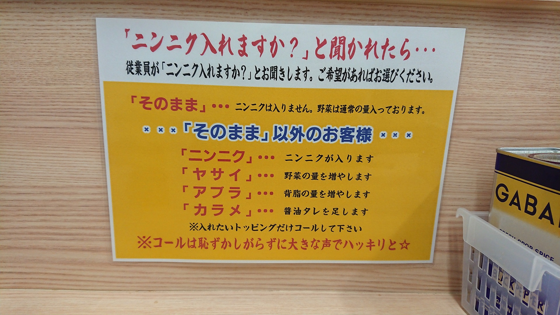 コールはJ系らしく4種類、ほか壁側に刻み生姜もコールで頼めるとのこと。アブラとセットでコールするならアリですね。