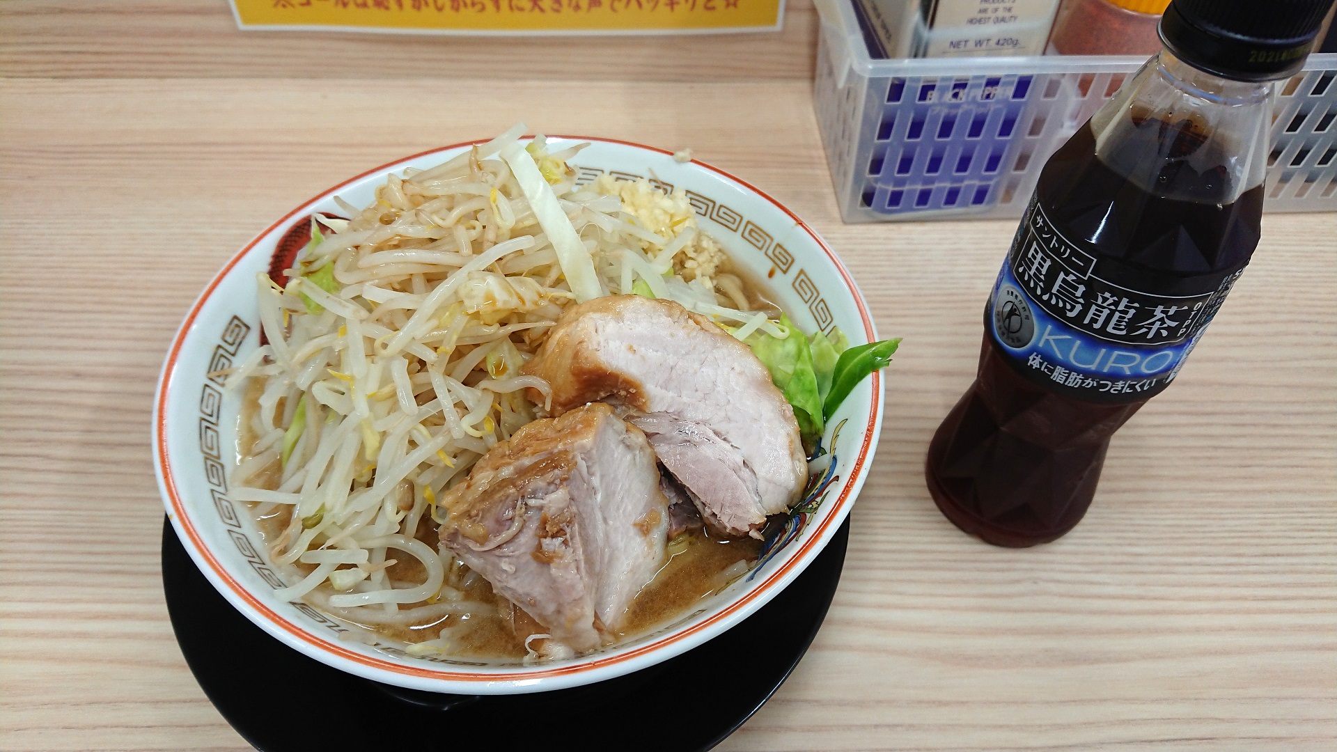 オープン直後でもちろん初めての訪問なので、注文はラーメン小に黒烏龍茶。コールはニンニクカラメ。