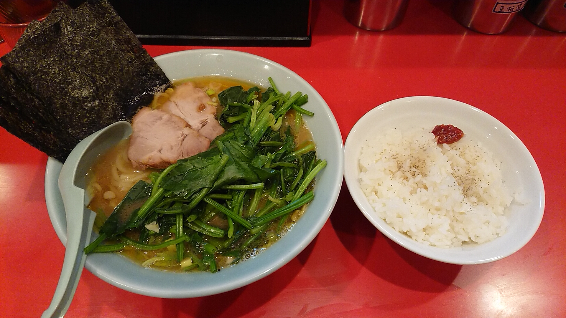 注文はラーメン並にライス、そしてお約束の横浜産ほうれん草を追加!長多屋麺なので、お好みはすべて普通です。