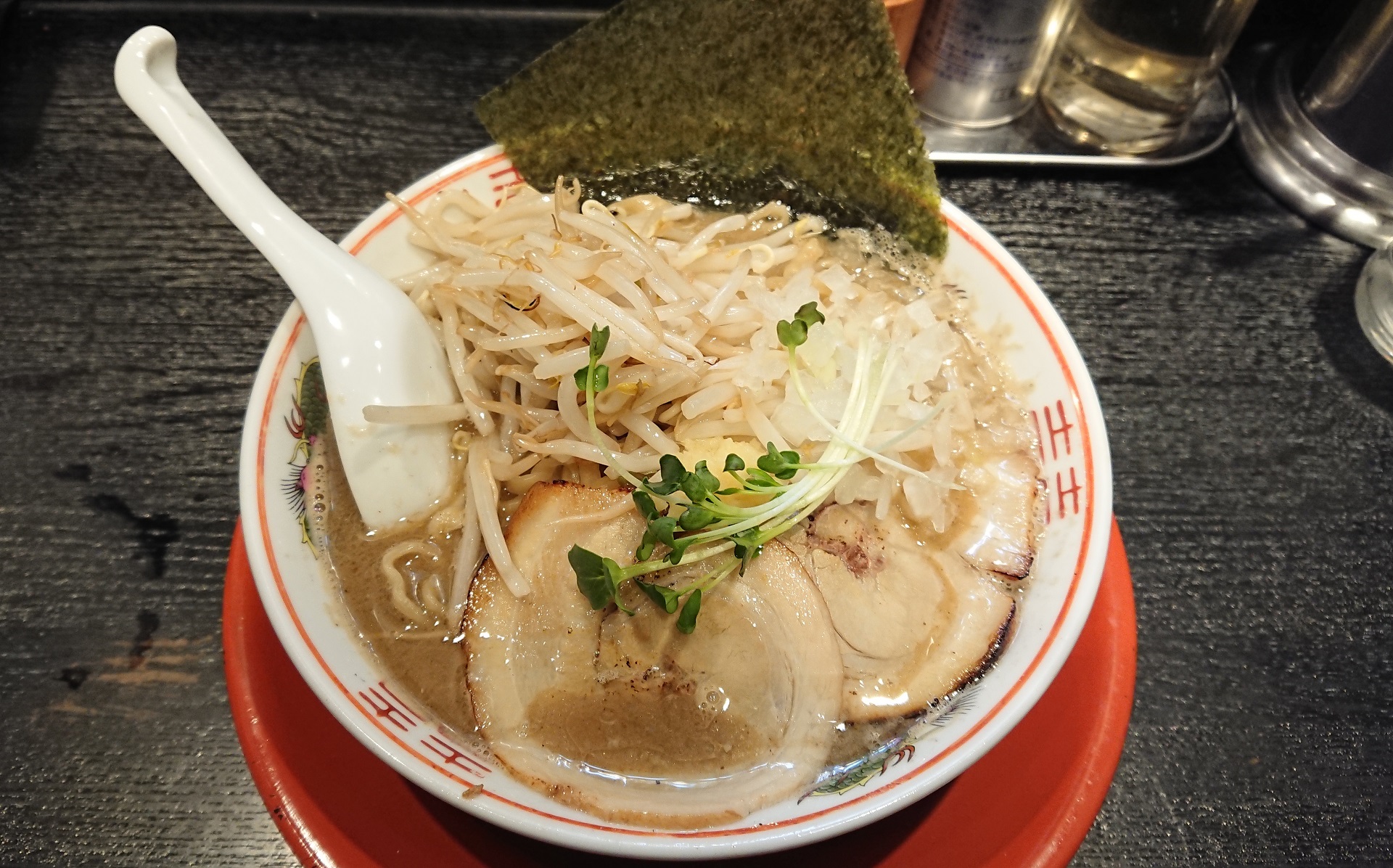 具のラインナップはチャーシュー、海苔、かいわれ、炒めもやし、薬味にはおろし生姜と玉ねぎで、長ねぎは無しです。
