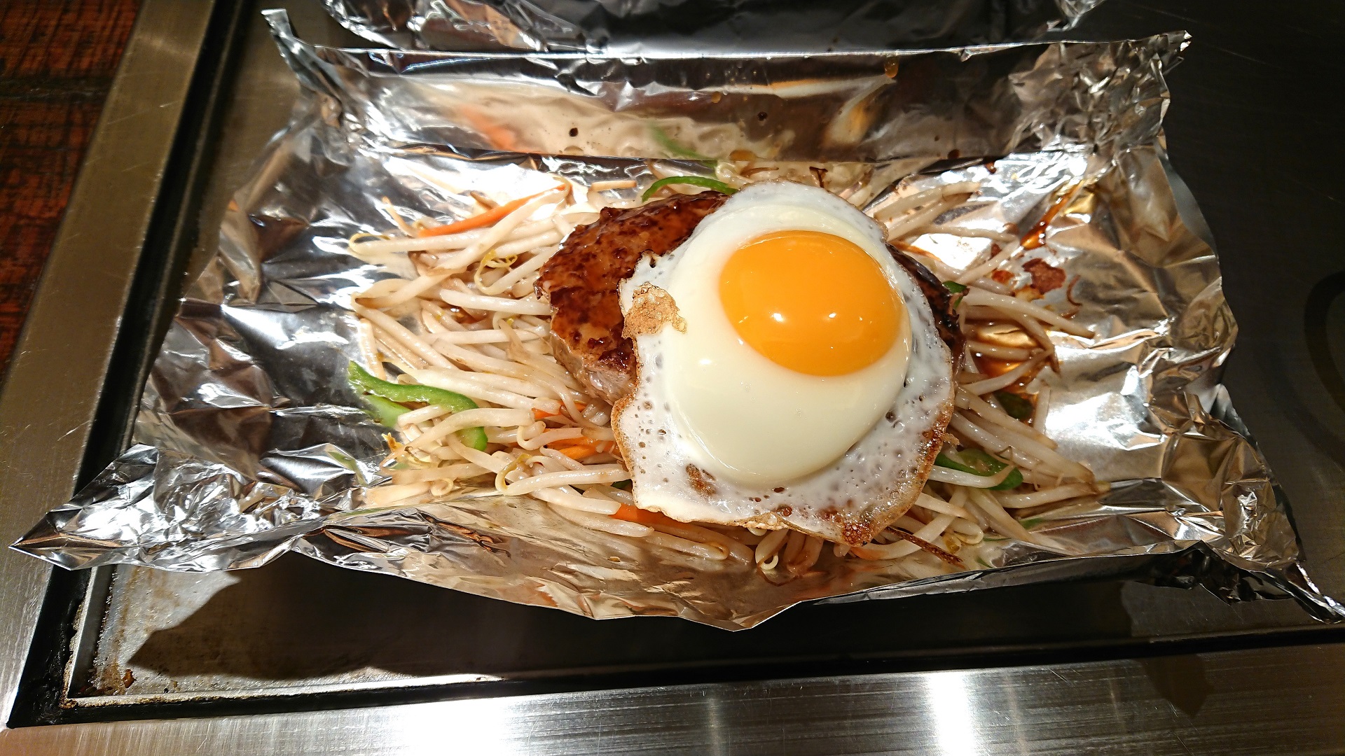 主役のハンバーグはジューシーで肉質良し、醤油ベースの照り焼きタレとも相性良好。目玉焼きの黄身を割りつつハンバーグと炒め野菜にくぐらせます。