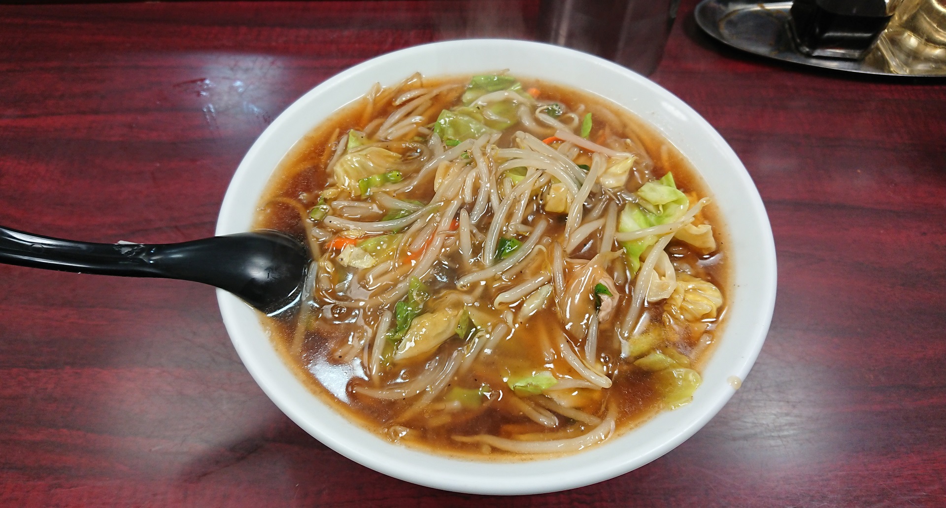 麺はこれまたクラシカルな細麺の縮れタイプ、餡の野菜は塩コショウがキリッと感じられるので甘目のスープと対照的。