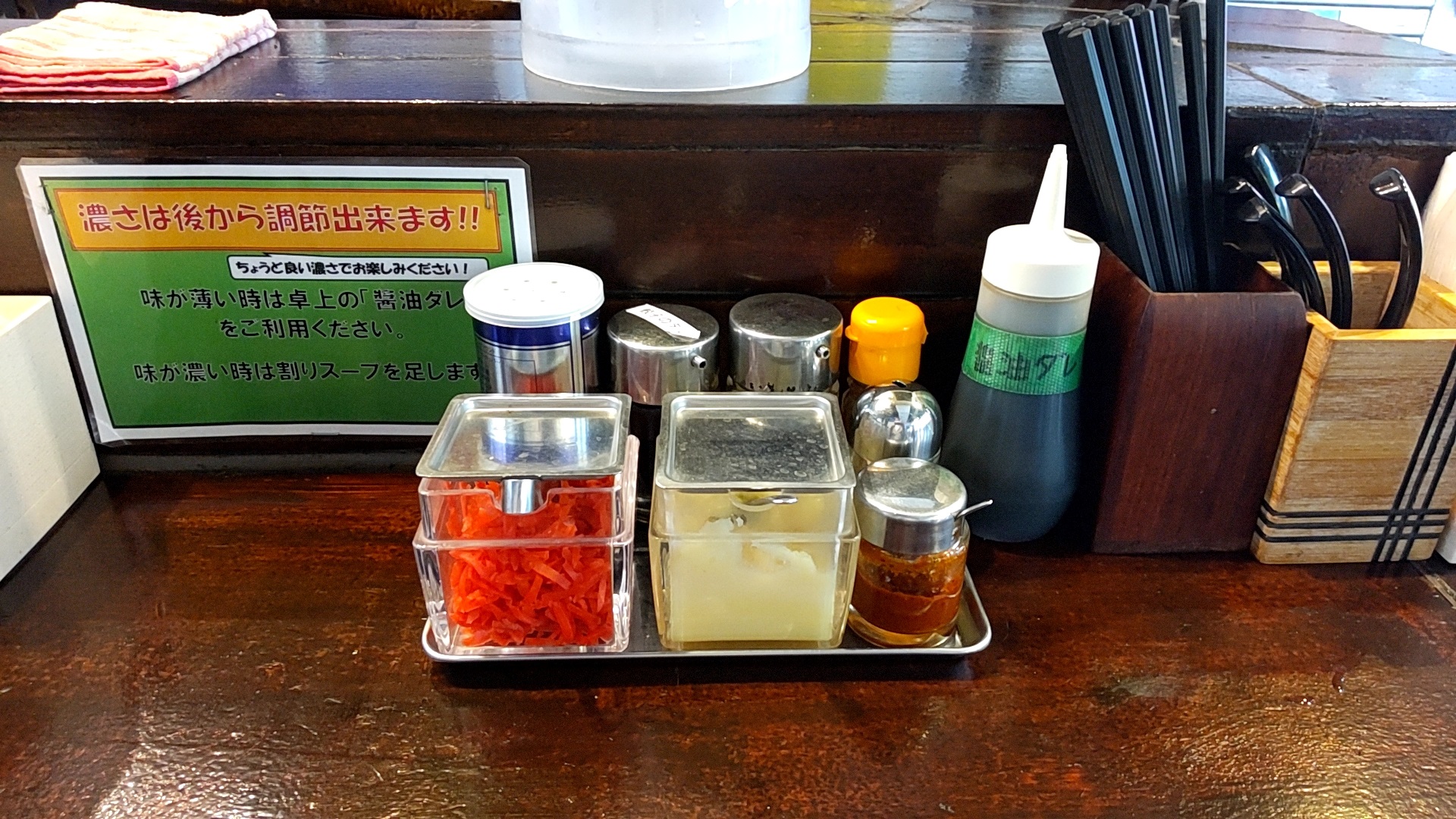 カウンターの薬味はおろし生姜の代わりに紅生姜、また奥側にスープの調整用の醤油ダレも。