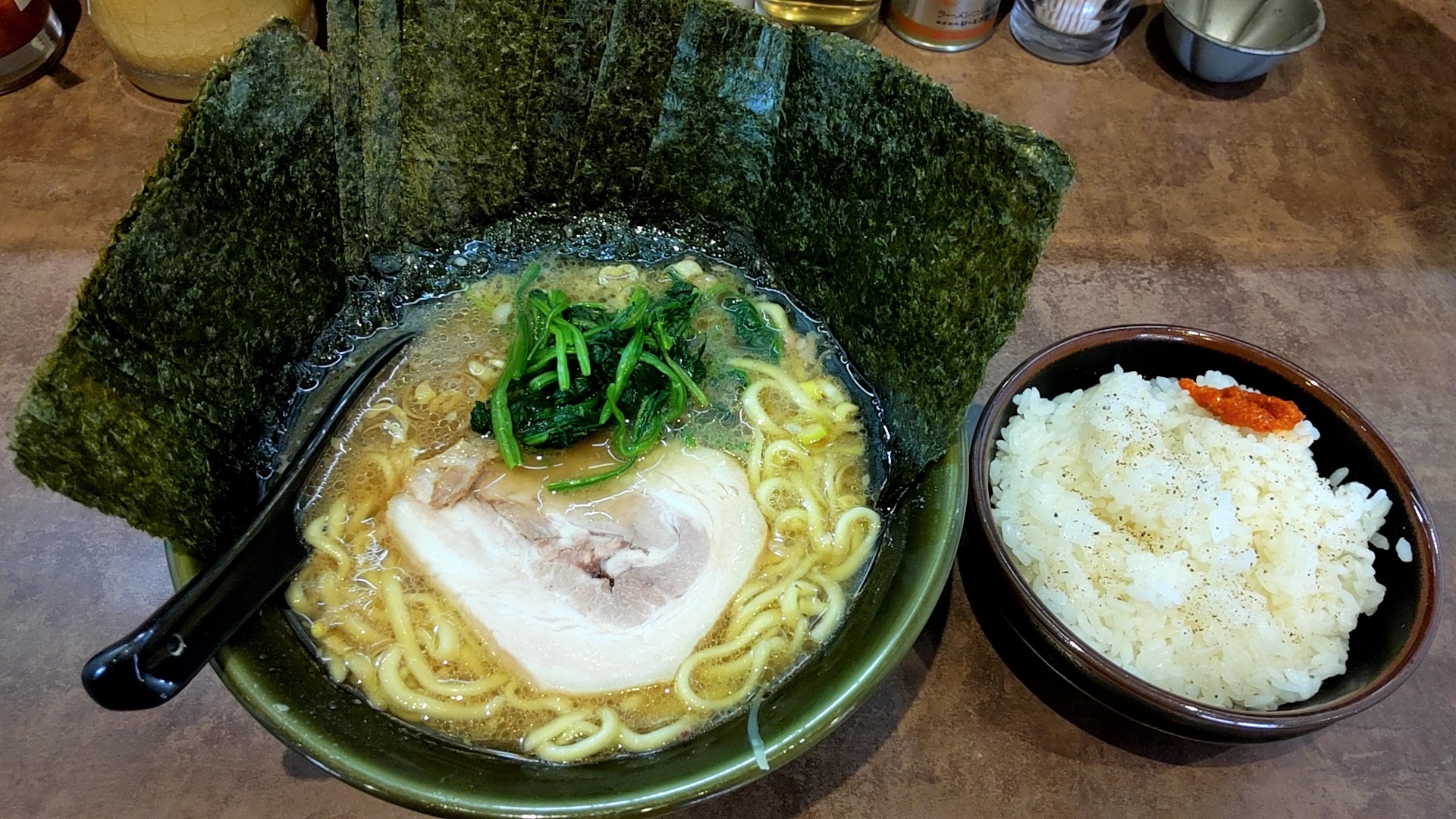 注文はラーメン並にのり増し+半ライス。大師店と鶴見店では醤油が大人しい印象だったので、今回はお好みは固め濃いめにしました。