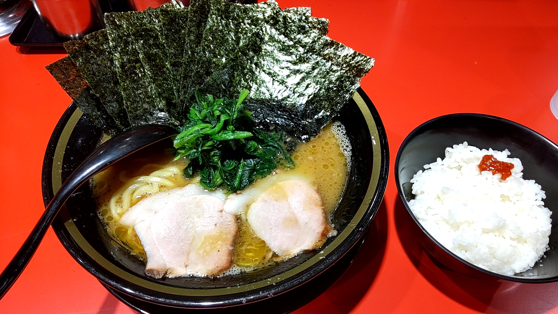 注文はラーメン750円+海苔100円+ライス120円。