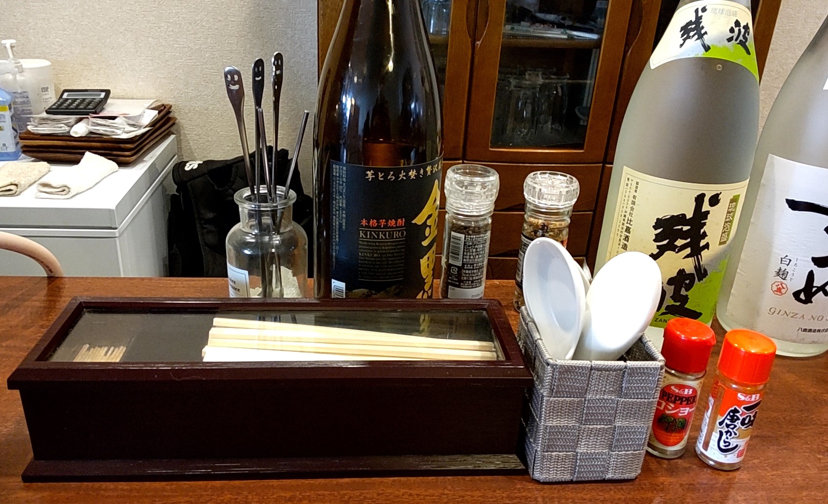 カウンター側は焼酎が並べられているほか、食器棚や保温おでん鍋などがあり、小料理屋を思わせます。