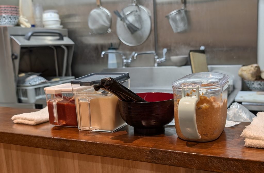 薬味はカウンターの上と下にそれぞれ配置されており、ライス用のニンニクがありますね(何気に好き)。