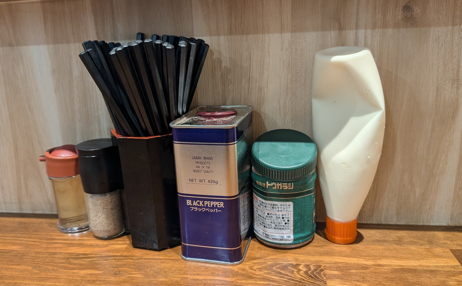 薬味はカウンターの上と下にそれぞれ配置されており、ライス用のニンニクがありますね(何気に好き)。