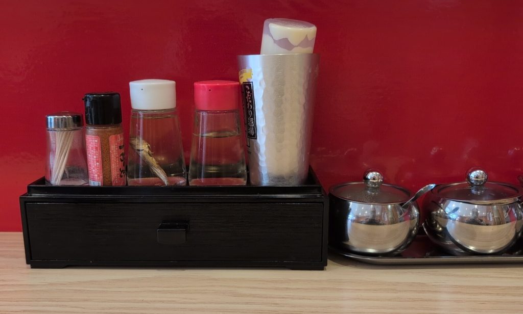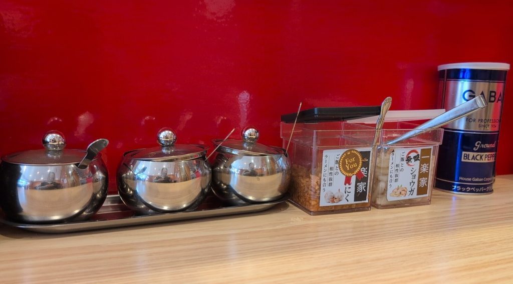 薬味はニンニク、辛味噌、おろししようがに加えて極みニンニク、刻みしょうが、マヨネーズ。